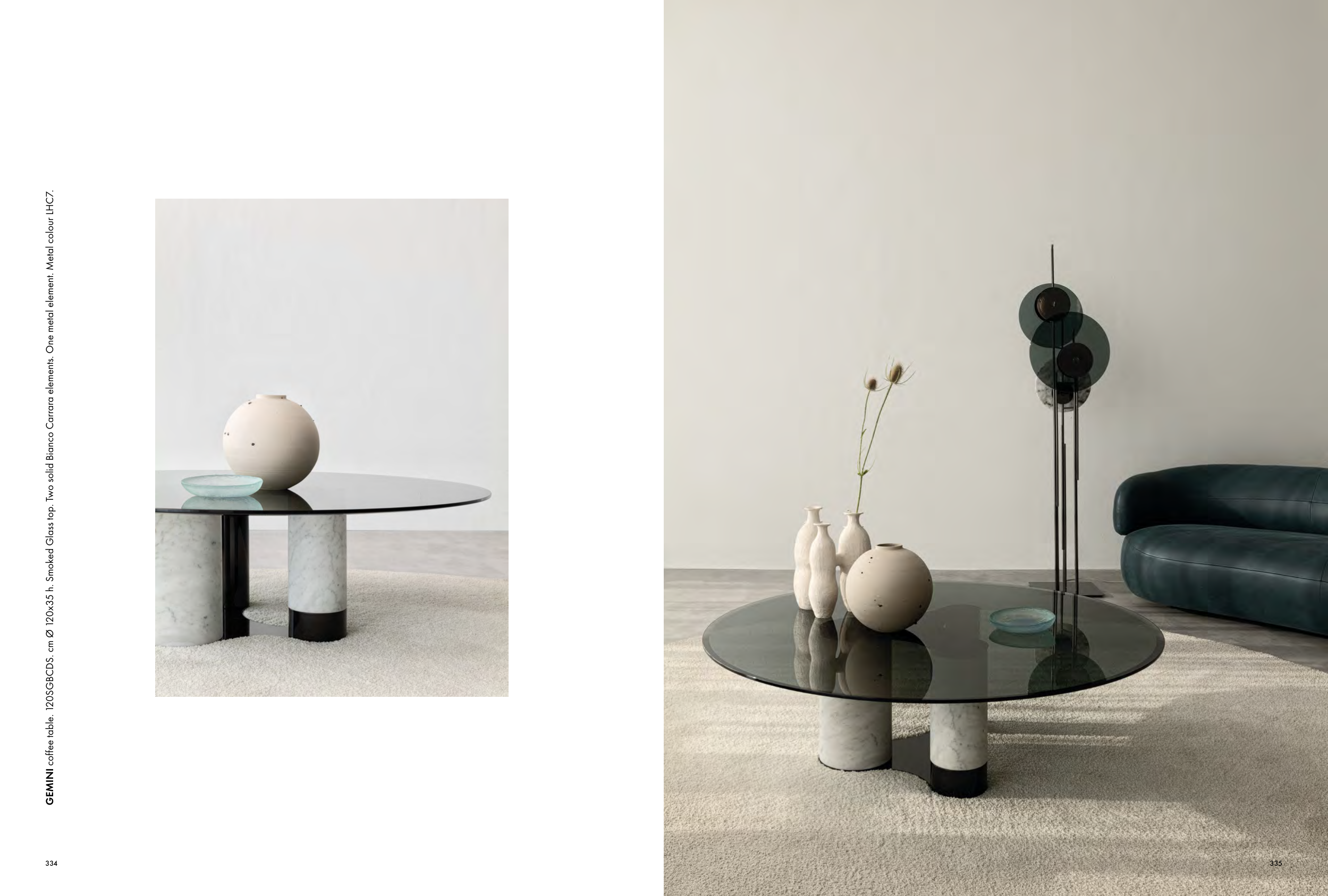 GEMINI coffee table. 120SGBCDS. cm Ø 120x35 h. Smoked Glass top. Two solid Bianco Carrara elements. One metal element. Metal colour LHC7.