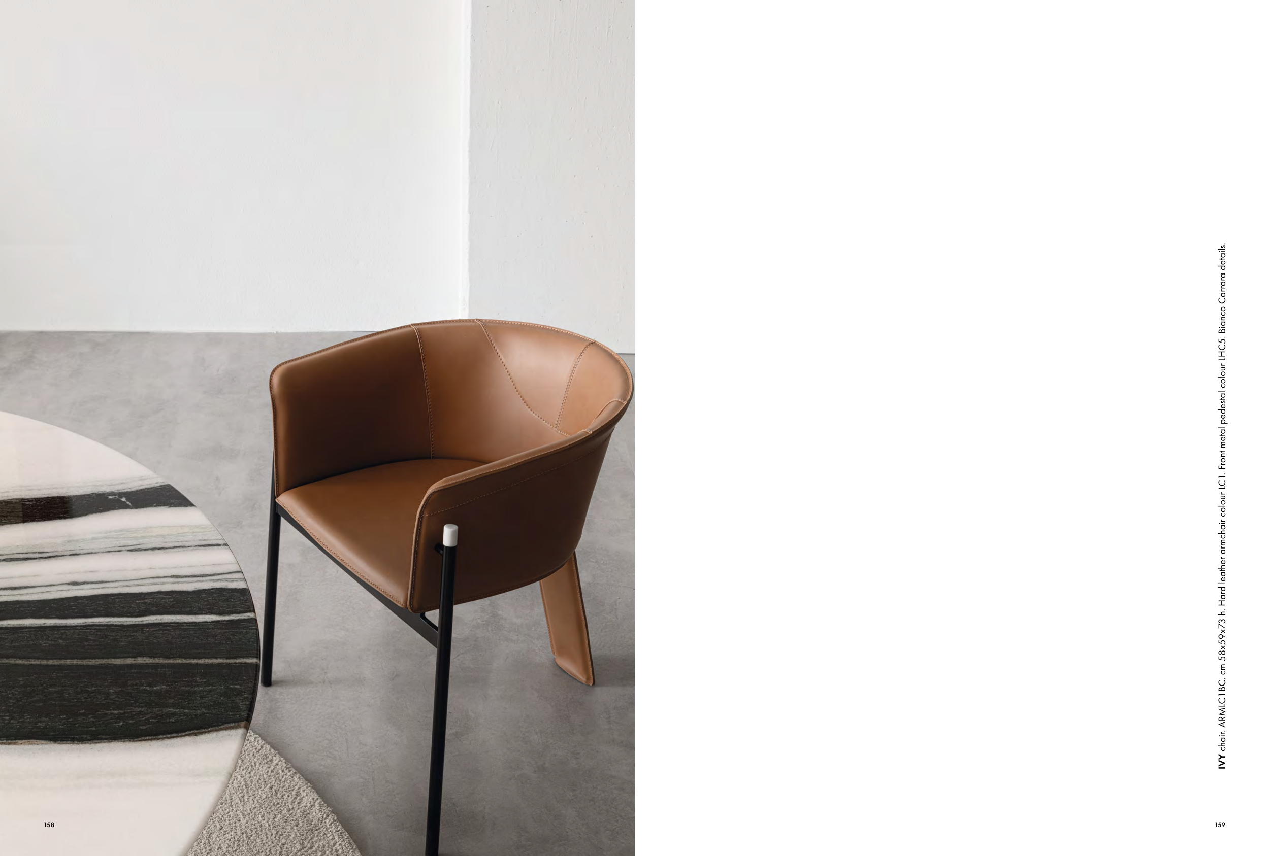 IVY chair. ARMLC1BC. cm 58x59x73 h. Hard leather armchair colour LC1. Front metal pedestal colour LHC5. Bianco Carrara details.