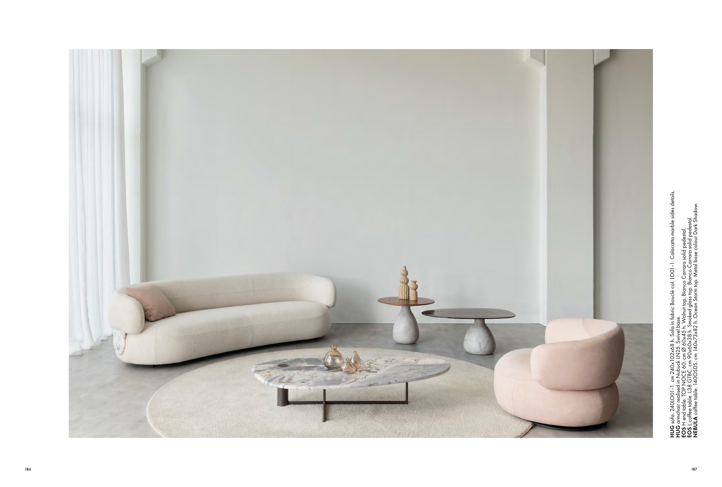 HUG sofa. 240LO01-1. cm 240x102x68 h. Sofa in fabric Bouclé col. LO01-1. Calacatta marble sides details.