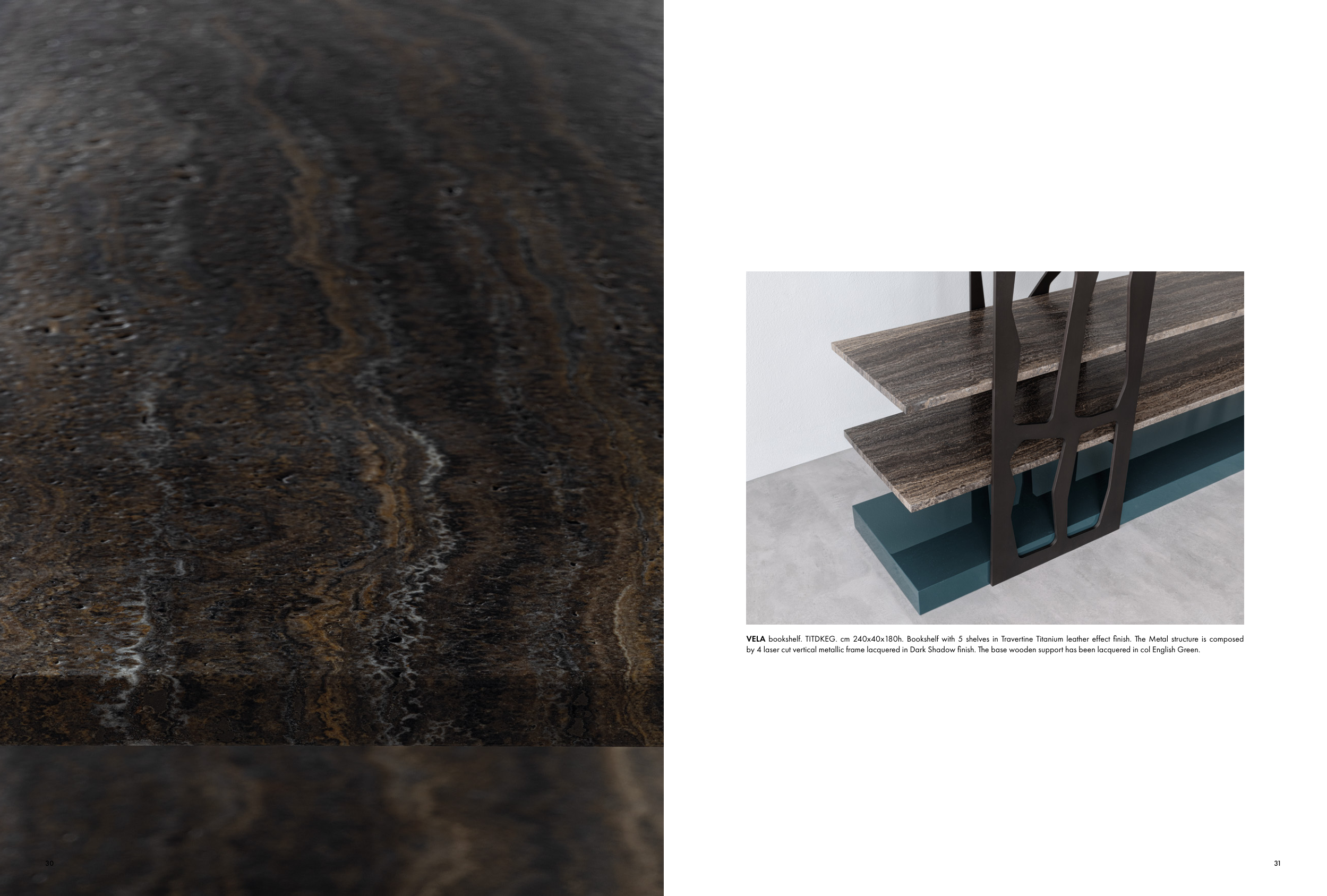 VELA bookshelf. TITDKEG. cm 240x40x180h. Bookshelf with 5 shelves in Travertine Titanium leather effect finish. The Metal structure is composed