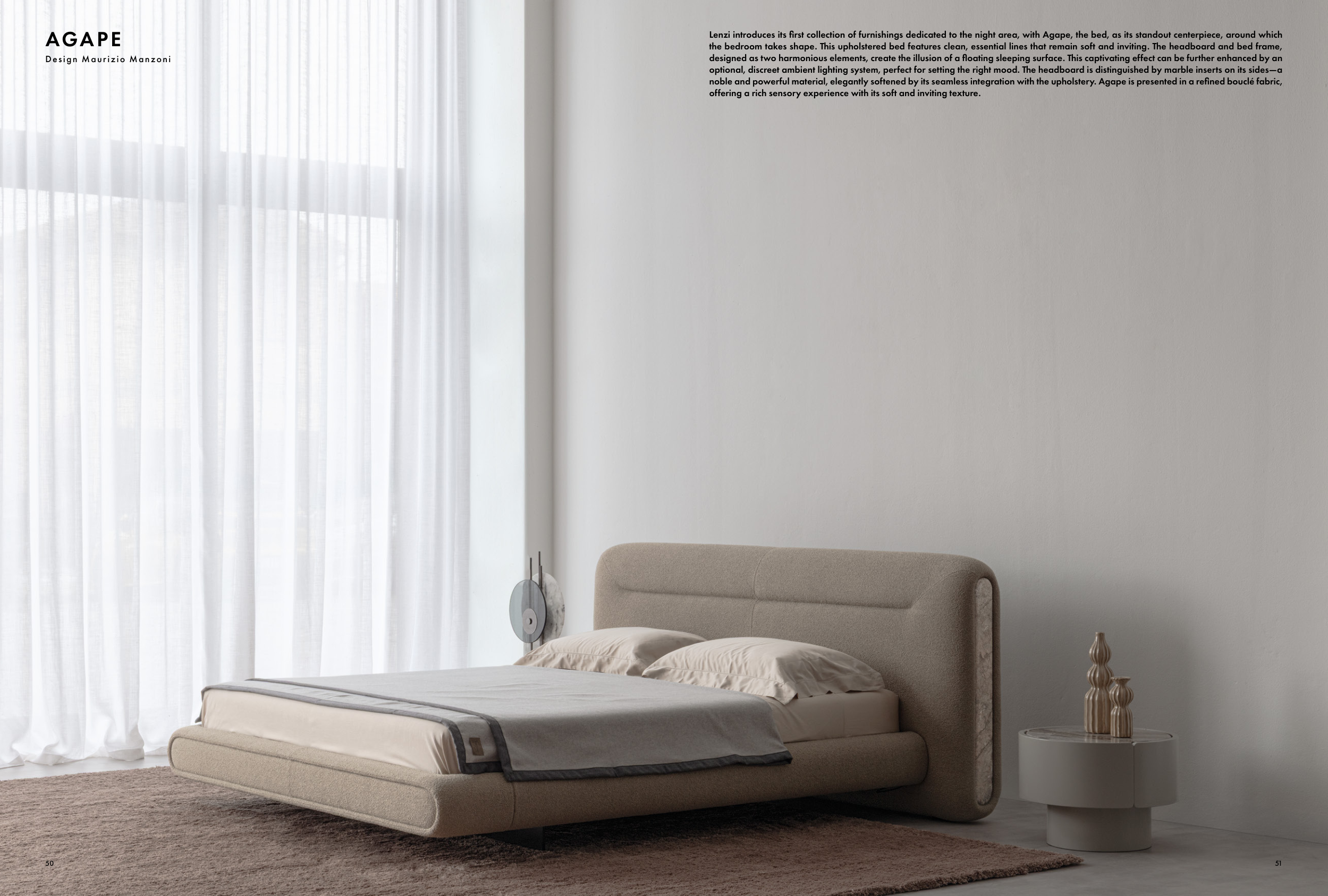 noble and powerful material, elegantly softened by its seamless integration with the upholstery. Agape is presented in a refined bouclé fabric,