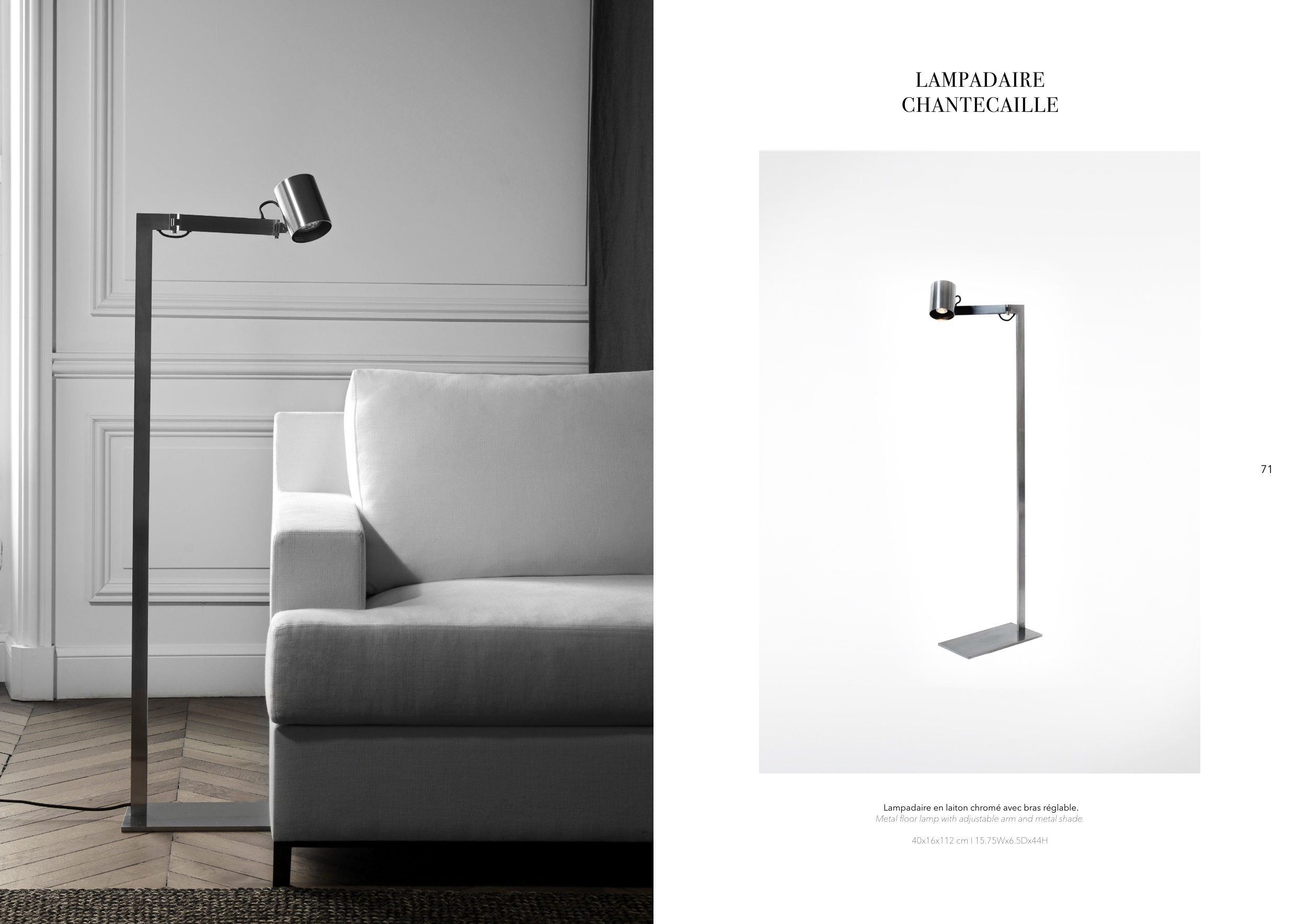 Lampadaire en laiton chromé avec bras réglable.
