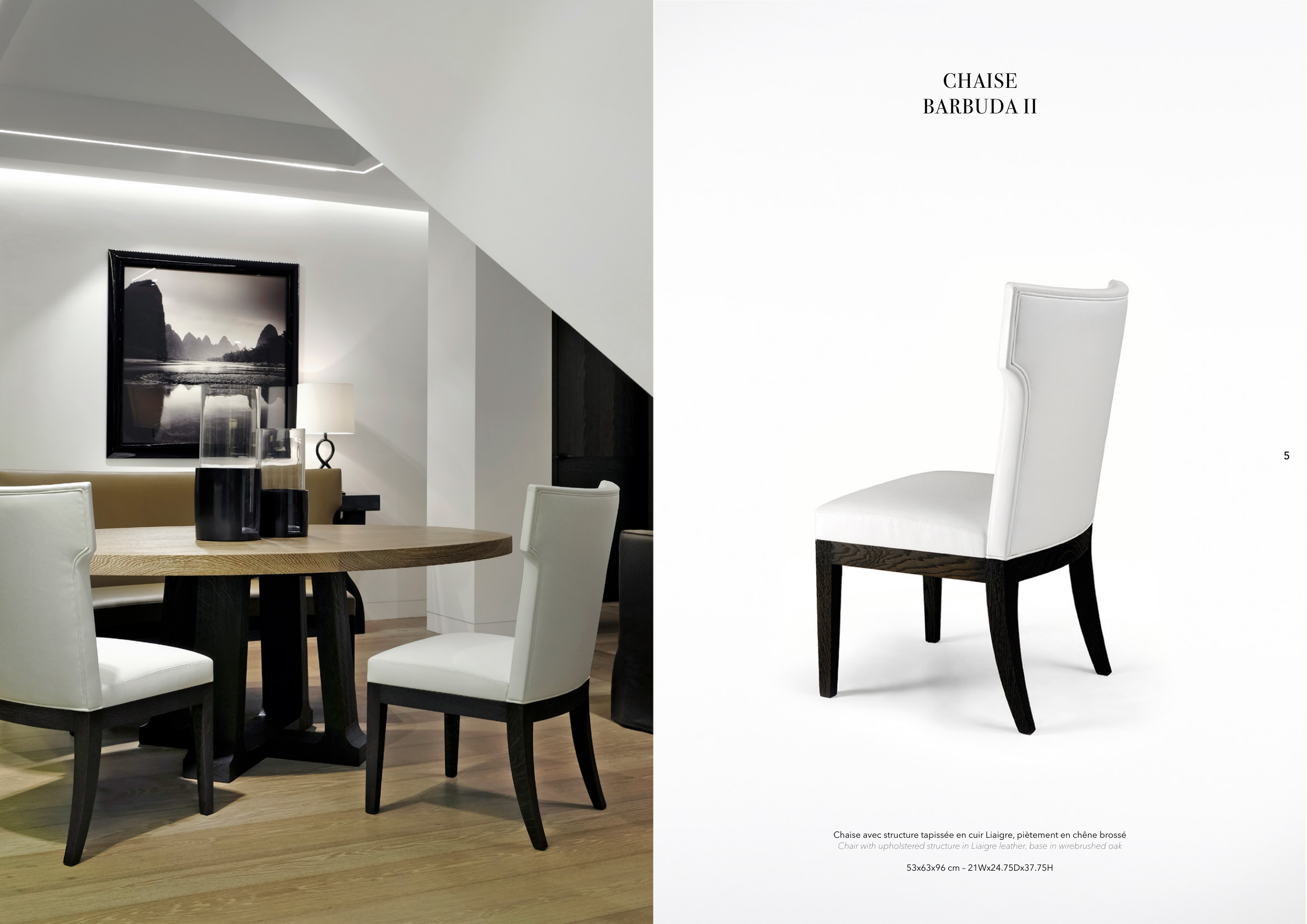 Chair with upholstered structure in Liaigre leather, base in wirebrushed oak