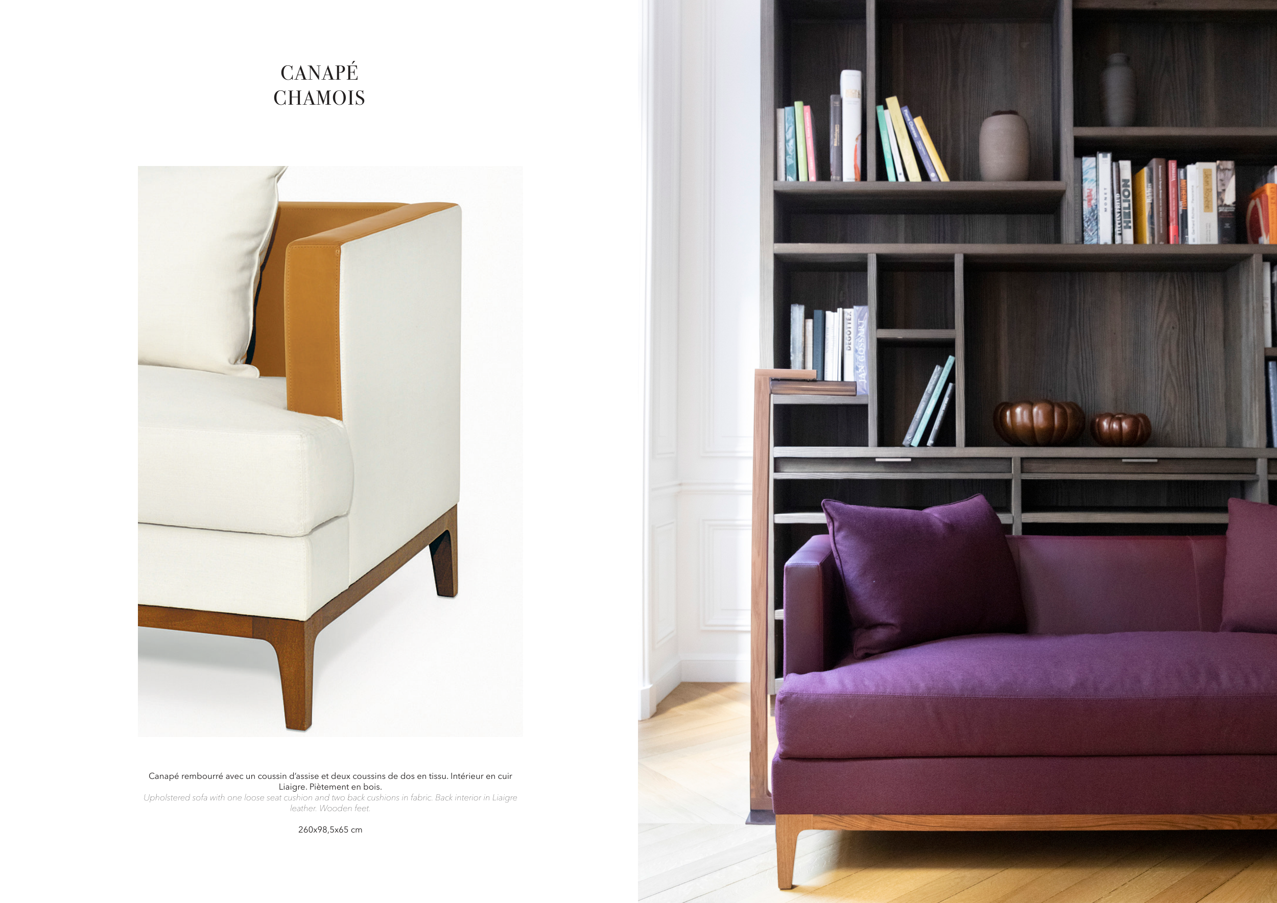 Upholstered sofa with one loose seat cushion and two back cushions in fabric. Back interior in Liaigre