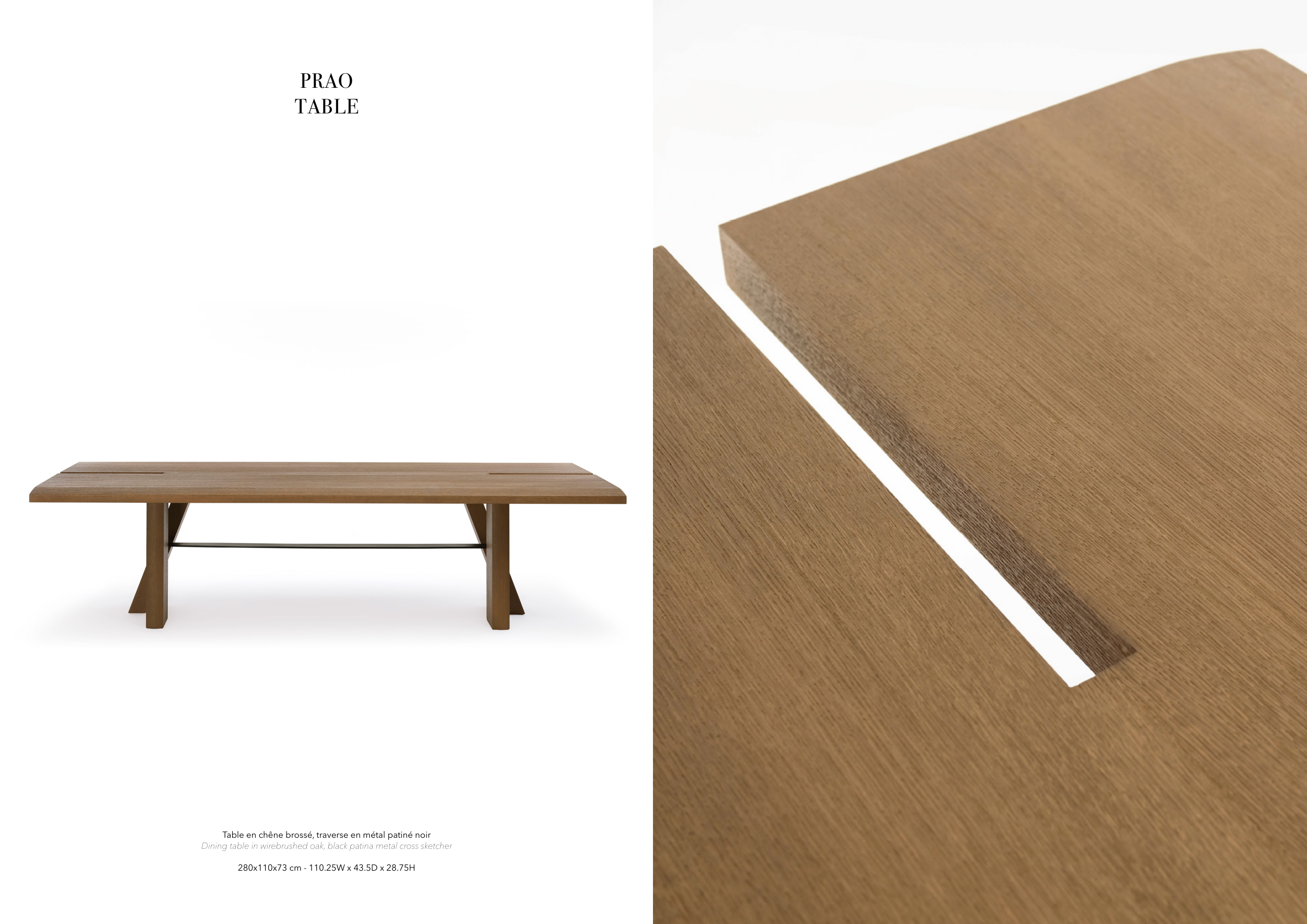 Table en chêne brossé, traverse en métal patiné noir