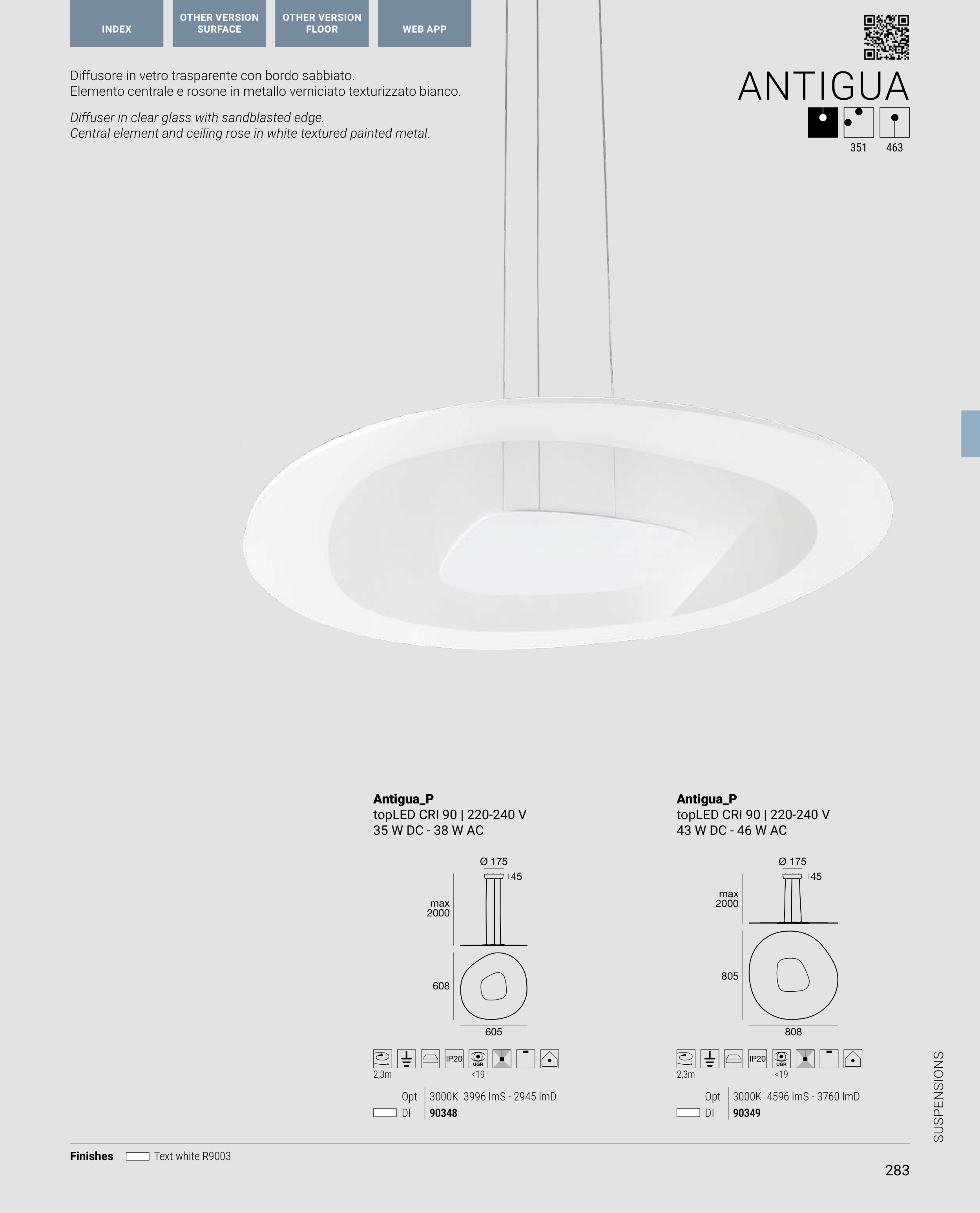 Diffuser in clear glass with sandblasted edge.