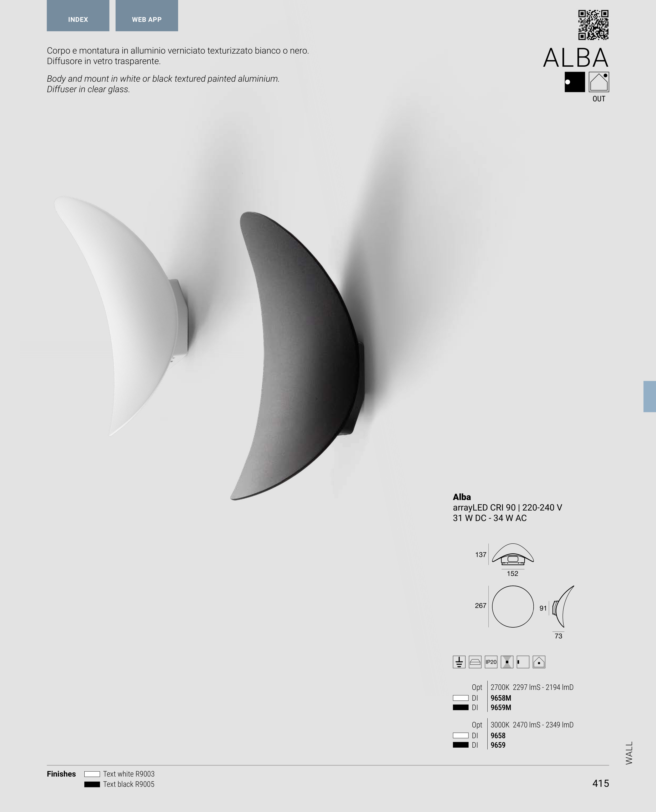 Body and mount in white or black textured painted aluminium.
