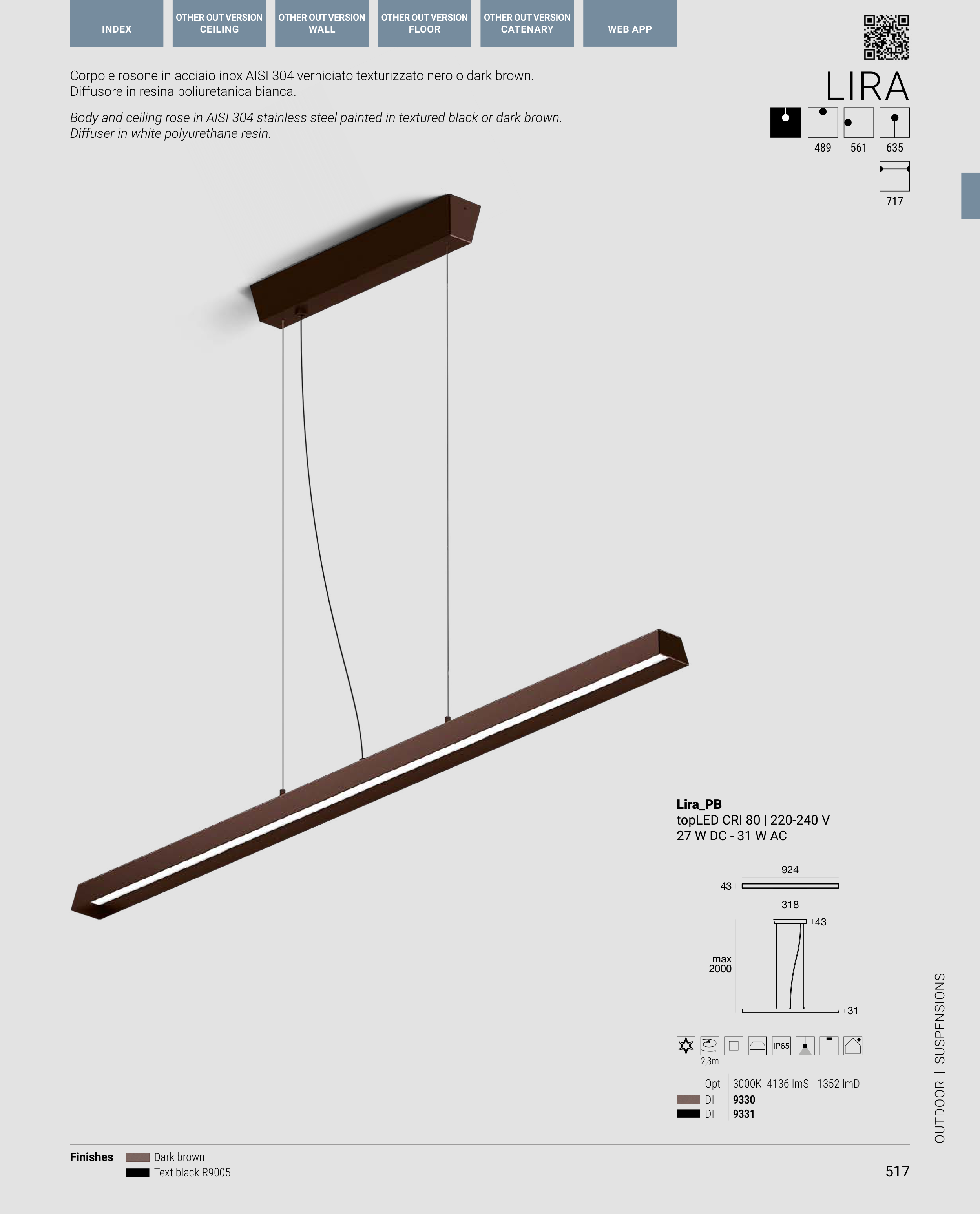 Body and ceiling rose in AISI 304 stainless steel painted in textured black or dark brown.