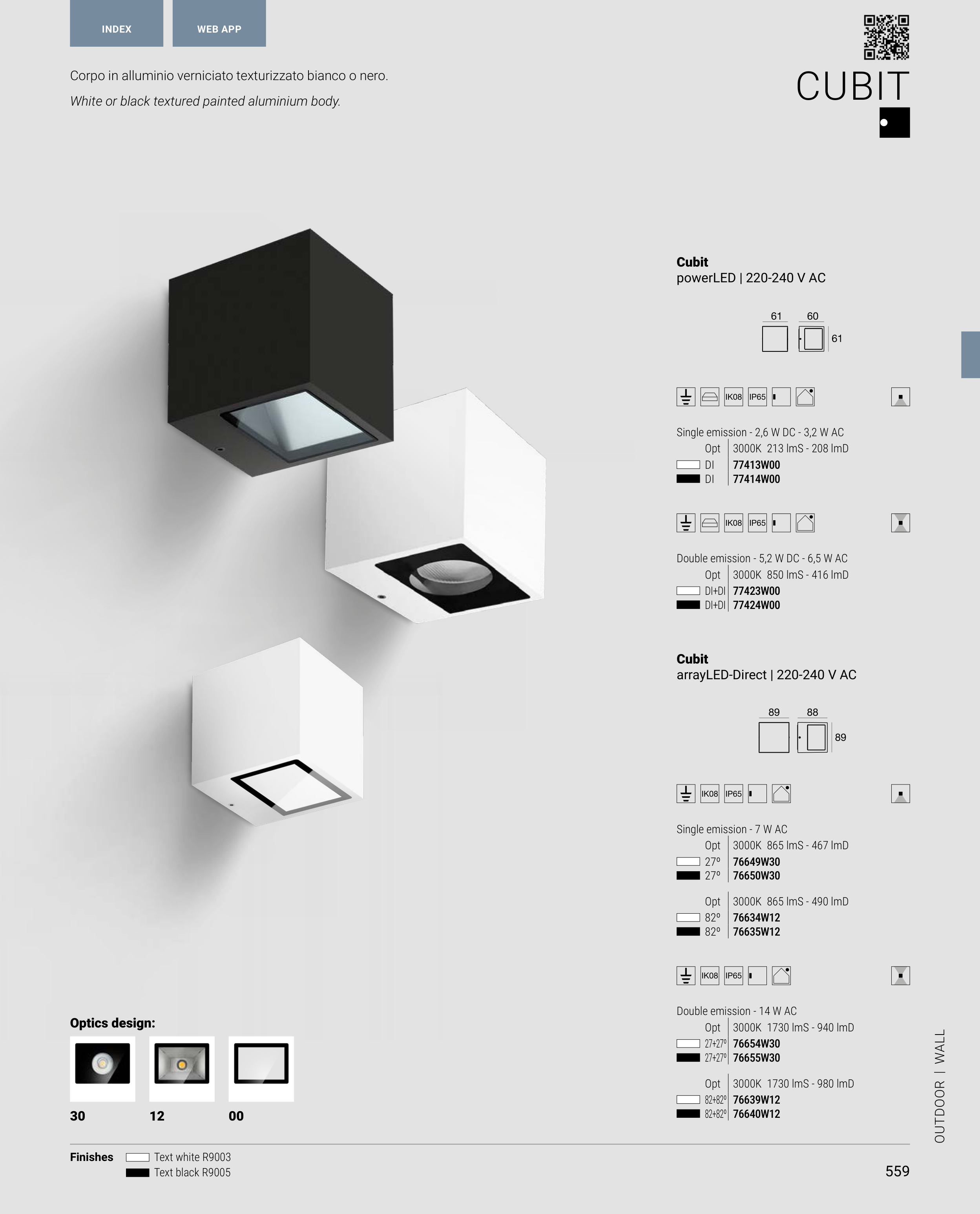 Corpo in alluminio verniciato texturizzato bianco o nero.