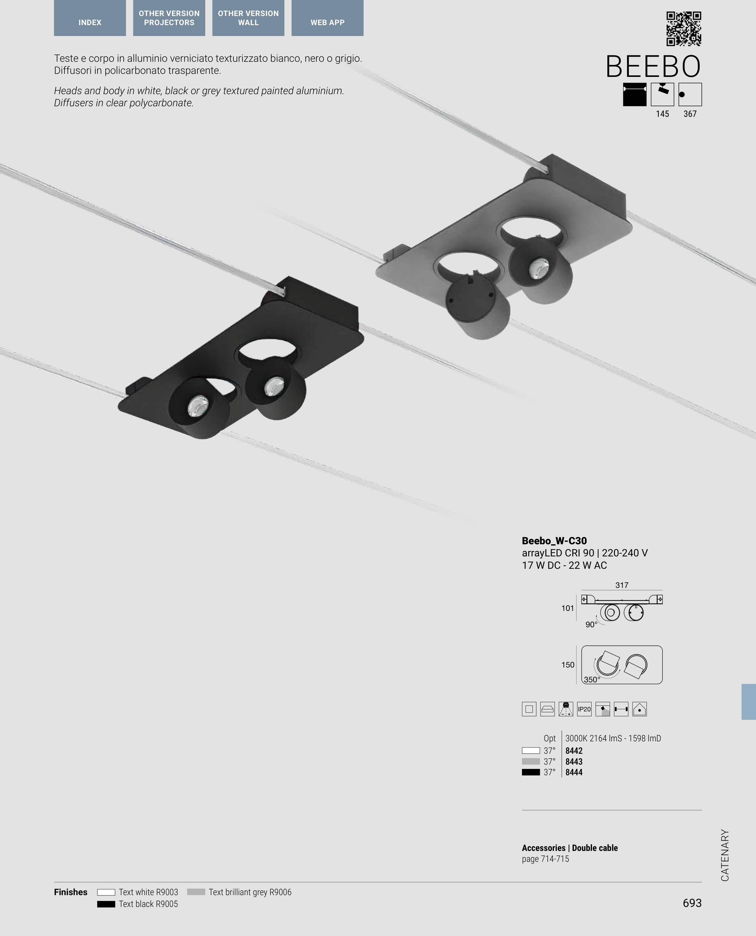 Teste e corpo in alluminio verniciato texturizzato bianco, nero o grigio.
