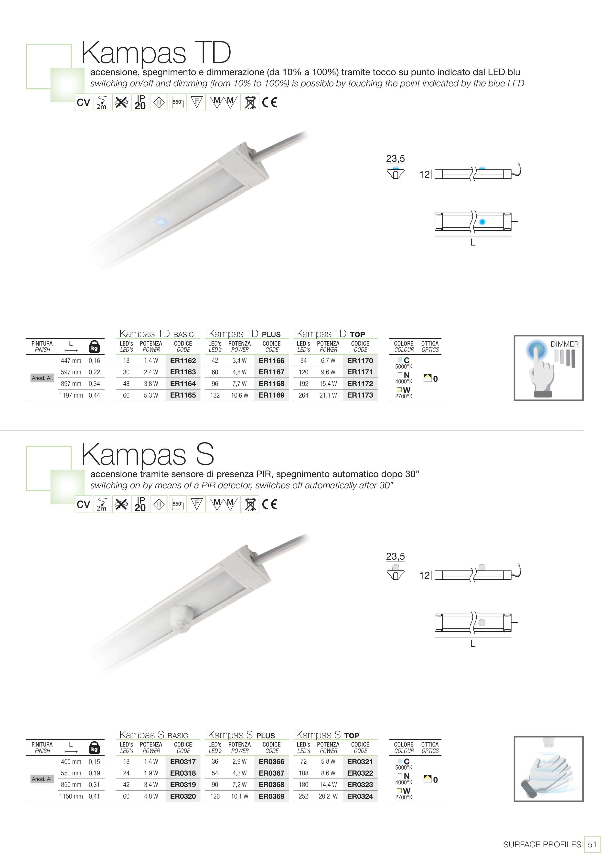switching on/off and dimming (from 10% to 100%) is possible by touching the point indicated by the blue LED