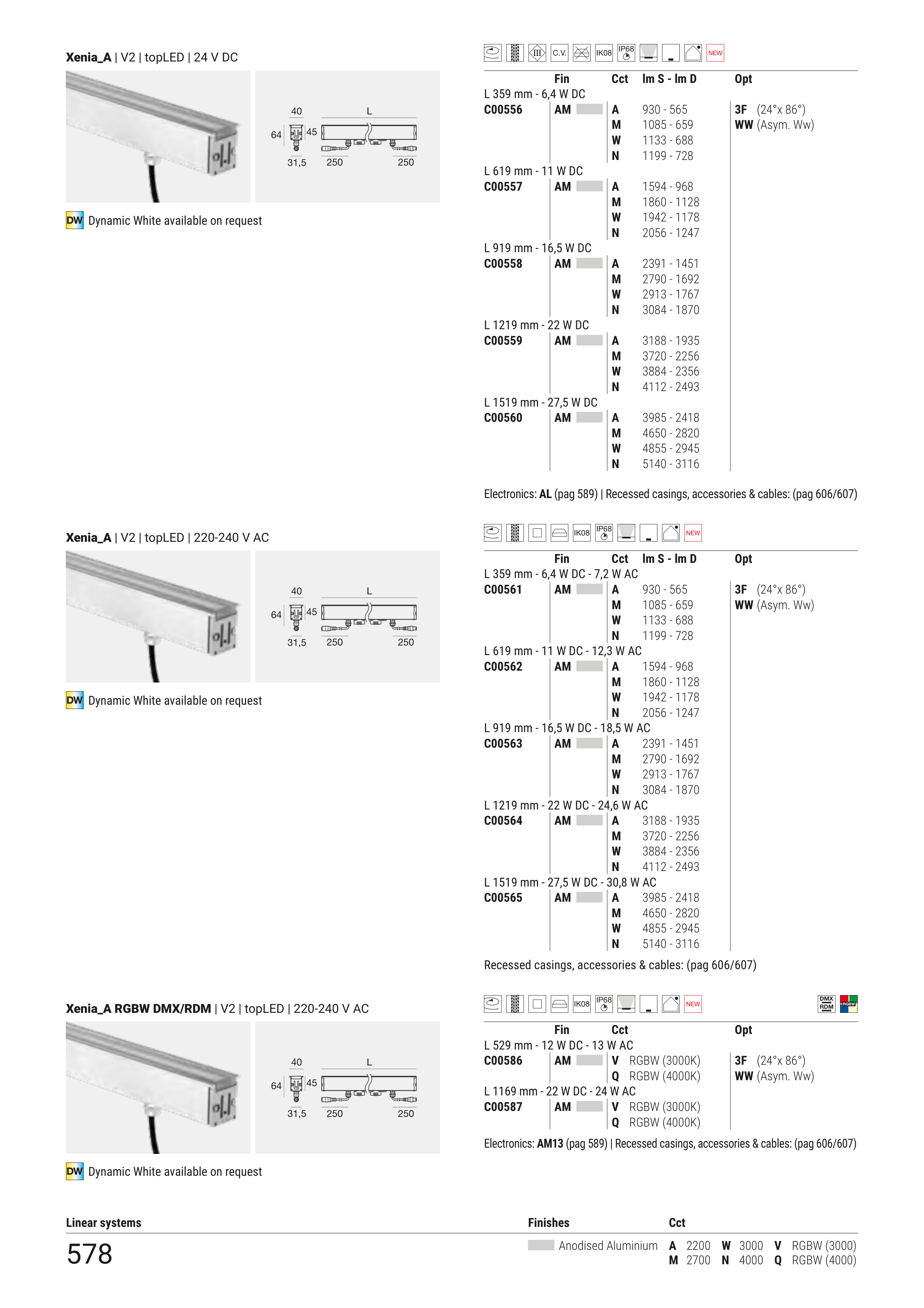 Electronics: AL (pag 589) | Recessed casings, accessories & cables: (pag 606/607)