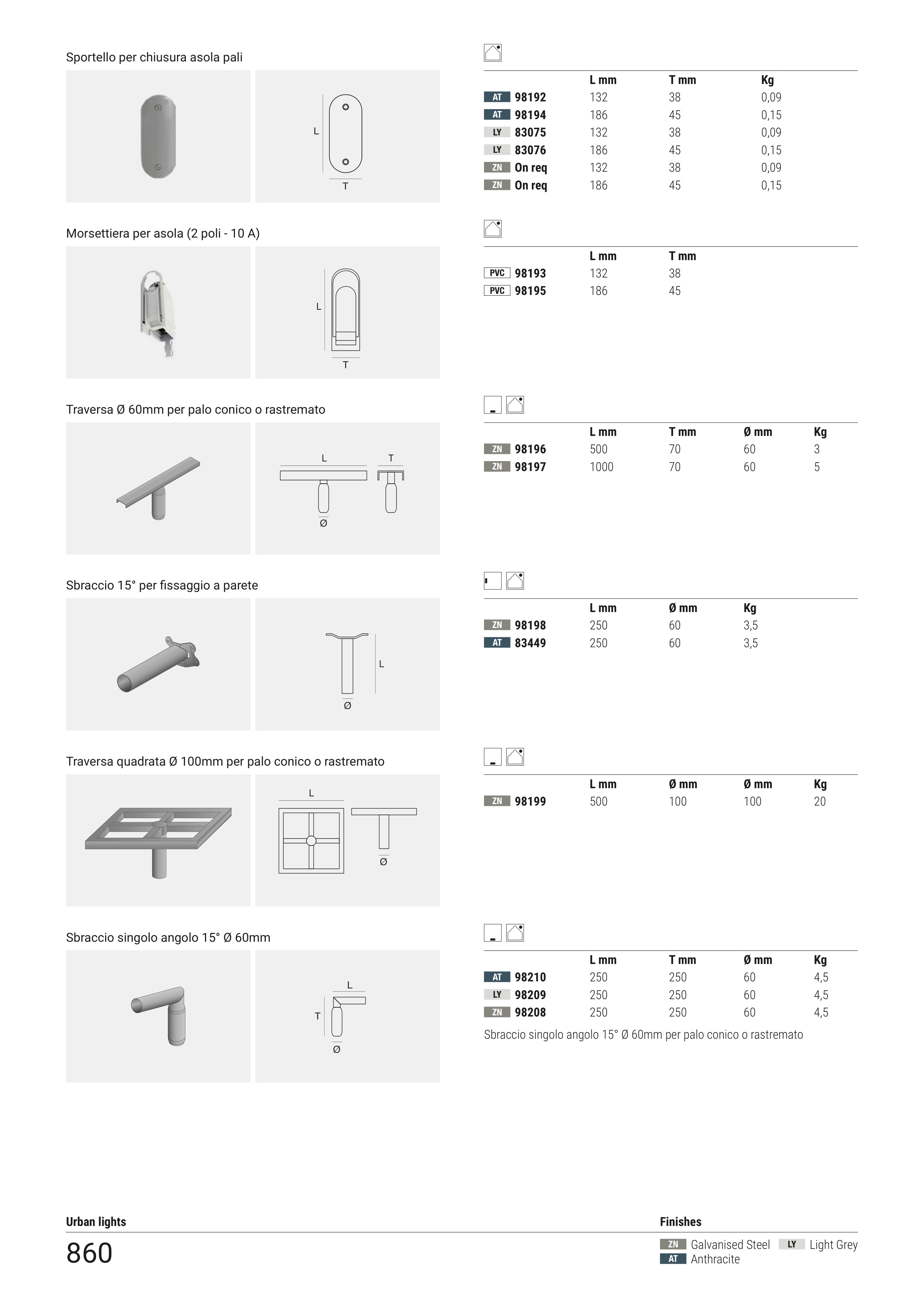Sbraccio singolo angolo 15° Ø 60mm per palo conico o rastremato