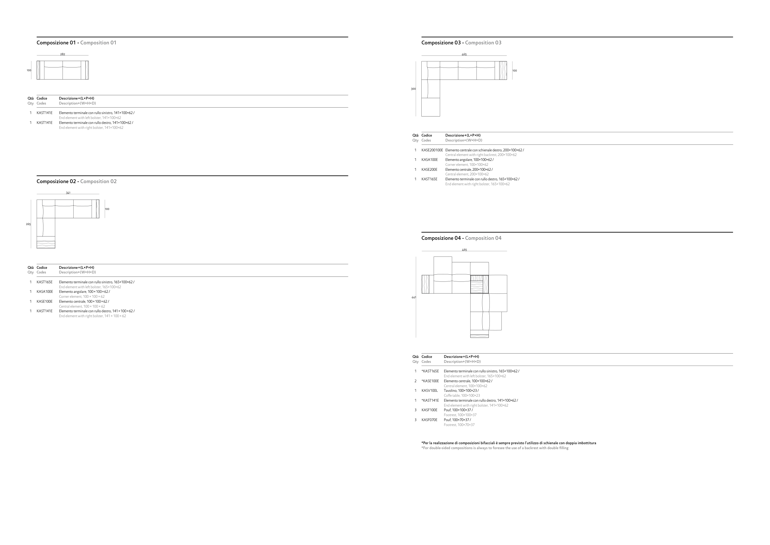*Per la realizzazione di composizioni bifacciali è sempre previsto l’utilizzo di schienale con doppia imbottitura
