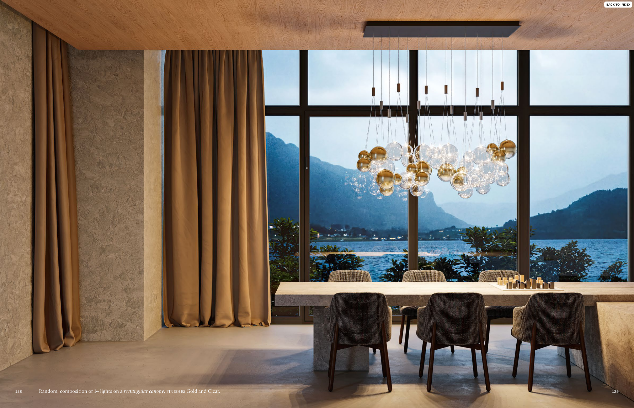 Random, composition of 14 lights on a rectangular canopy, FINISHES Gold and Clear.