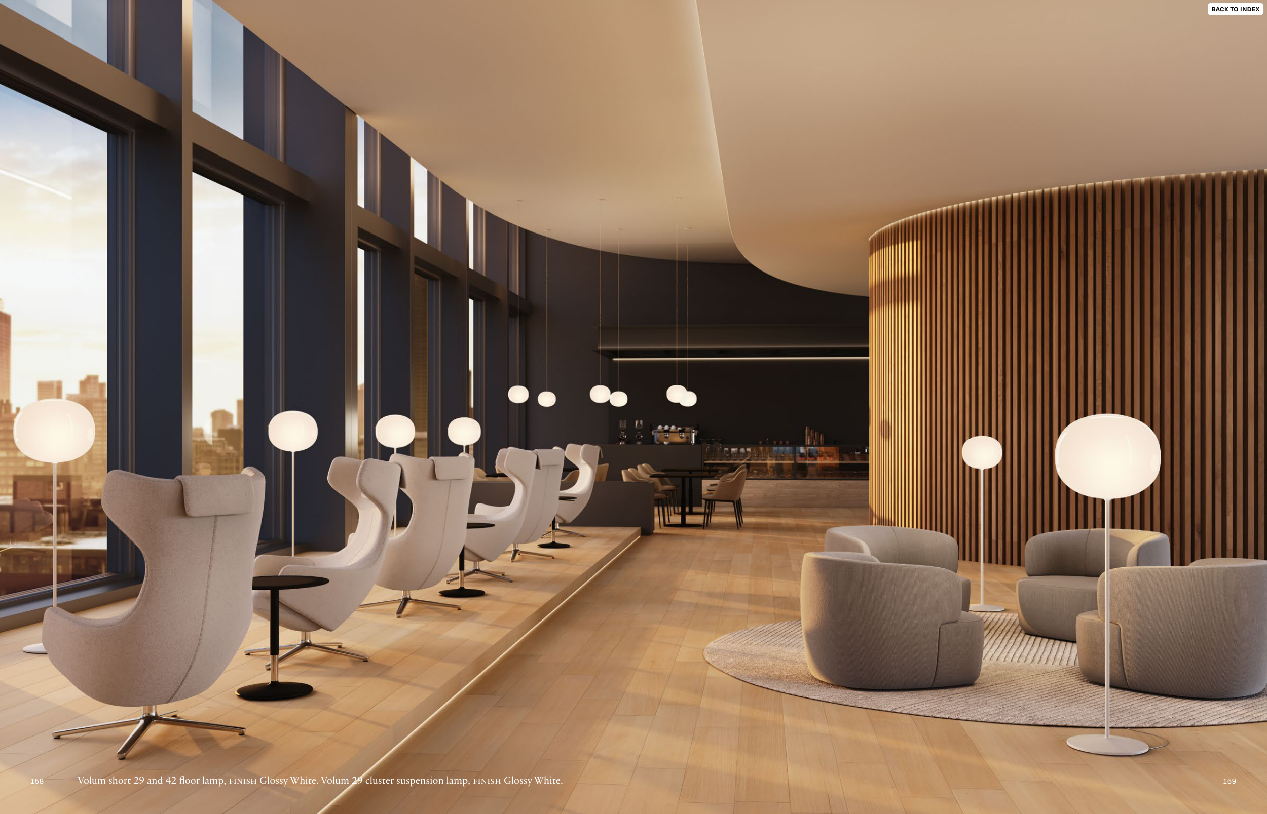 Volum short 29 and 42 floor lamp, FINISH Glossy White. Volum 29 cluster suspension lamp, FINISH Glossy White.