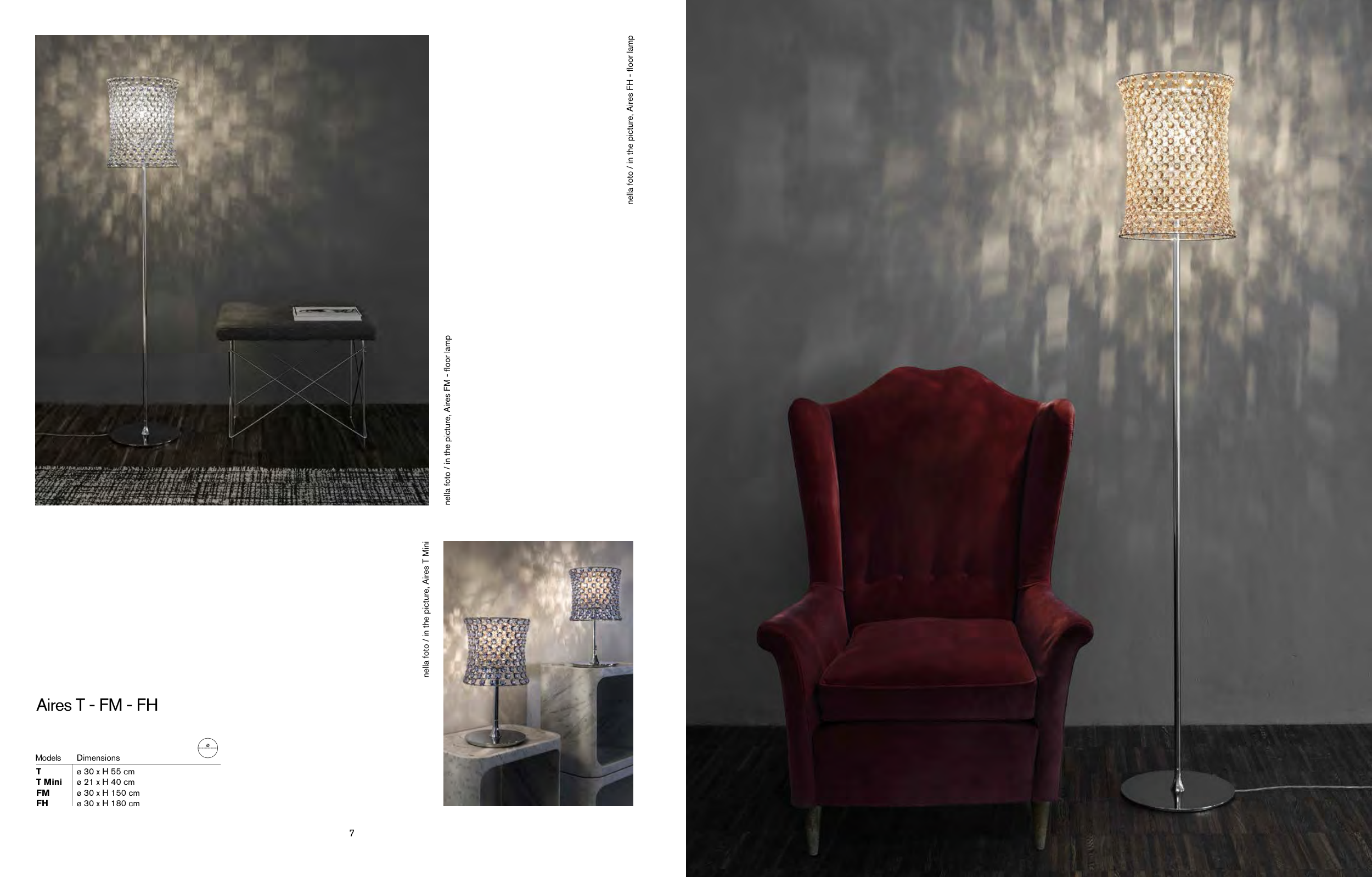 7 8 nella foto / in the picture, Aires FM - floor lamp nella foto / in the picture, Aires FH - floor lamp ø 30 x H 55 cm ø 21 x H 40 cm ø 30 x H 150 cm ø 30 x H 180 cm T T Mini FM FH Dimensions Models Aires T - FM - FH nella foto / in the picture, Aires T Mini ø
