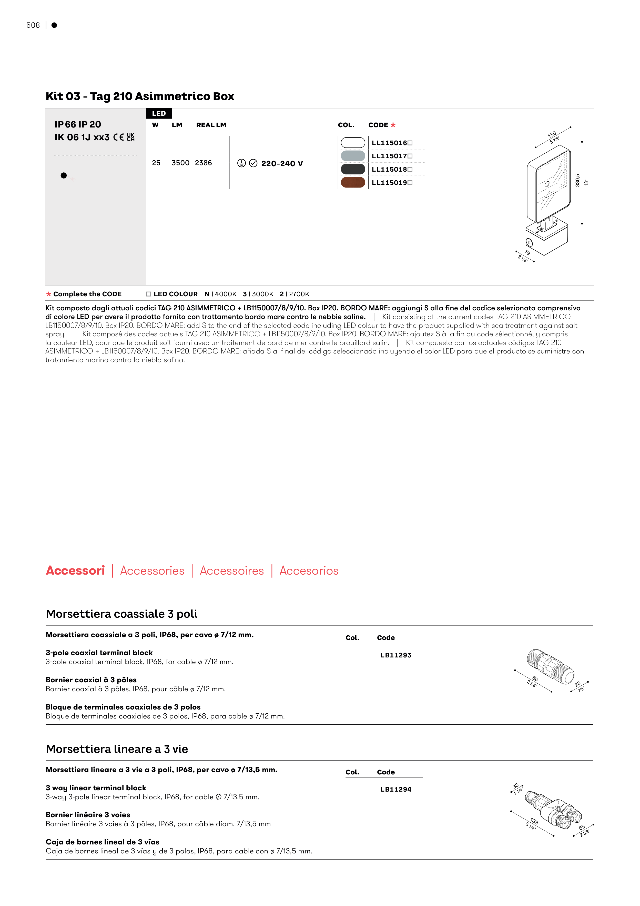Kit composto dagli attuali codici TAG 210 ASIMMETRICO + LB1150007/8/9/10. Box IP20. BORDO MARE: aggiungi S alla fine del codice selezionato comprensivo