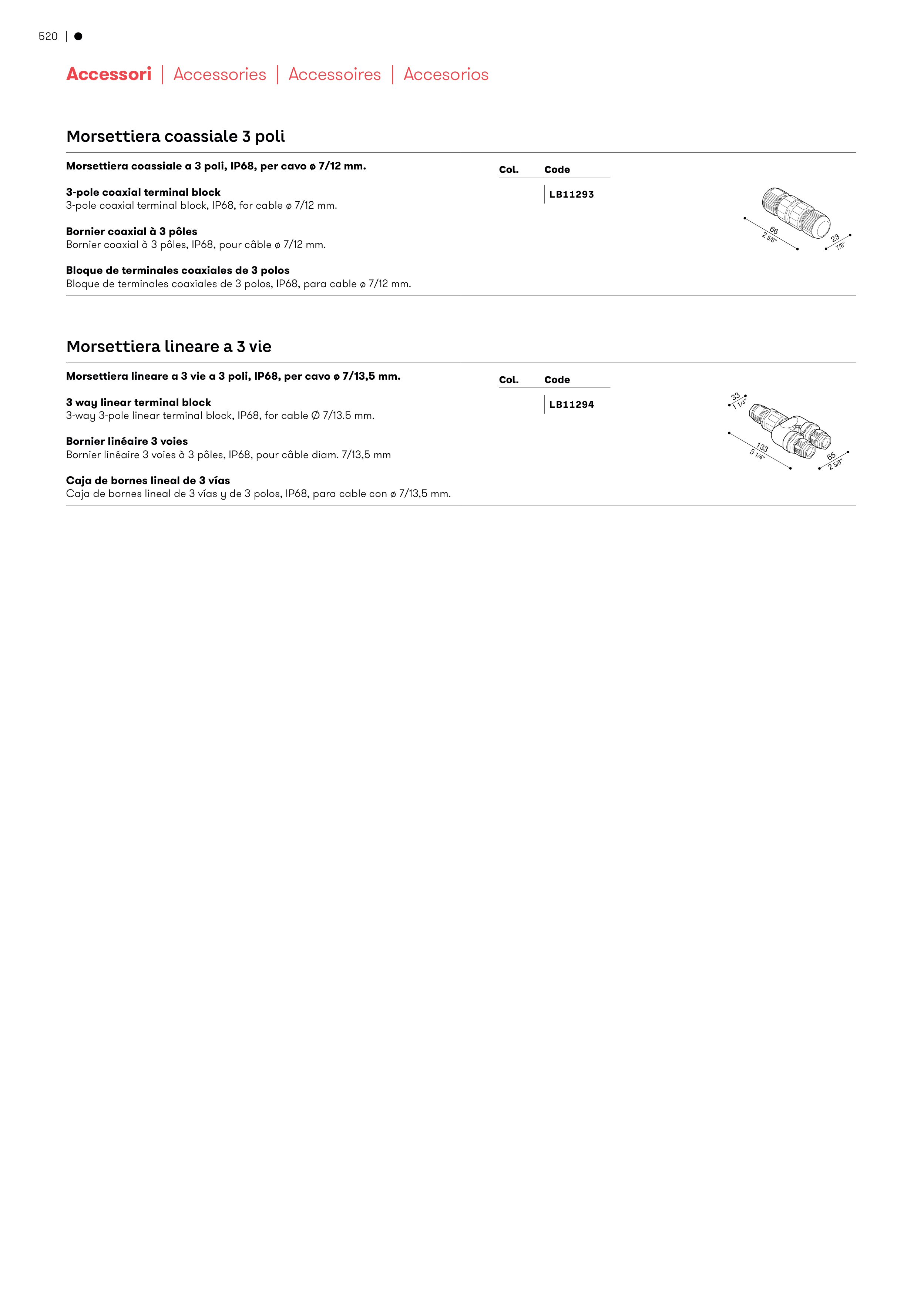 Morsettiera lineare a 3 vie a 3 poli, IP68, per cavo ø 7/13,5 mm.