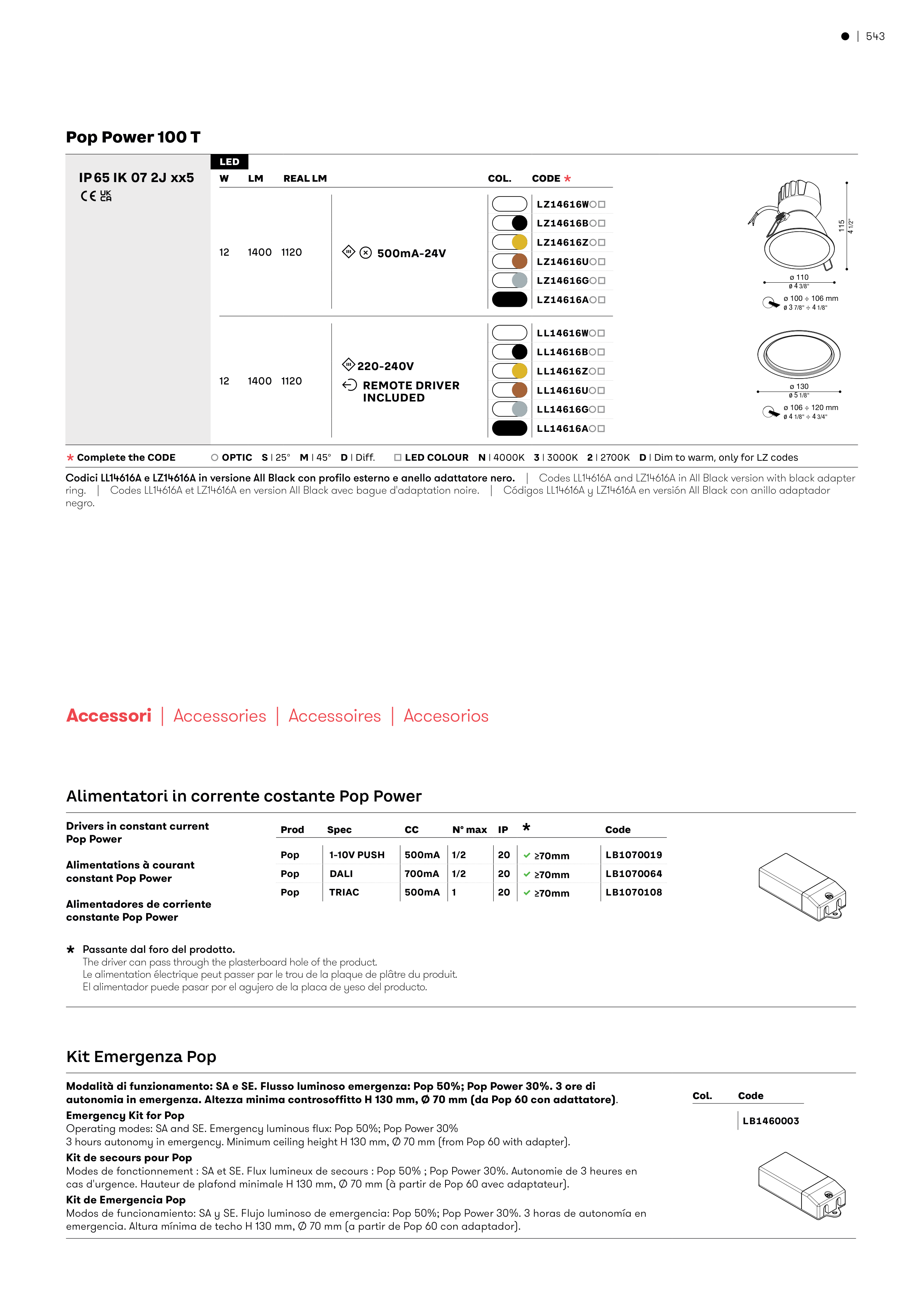 3 hours autonomy in emergency. Minimum ceiling height H 130 mm, Ø 70 mm (from Pop 60 with adapter).