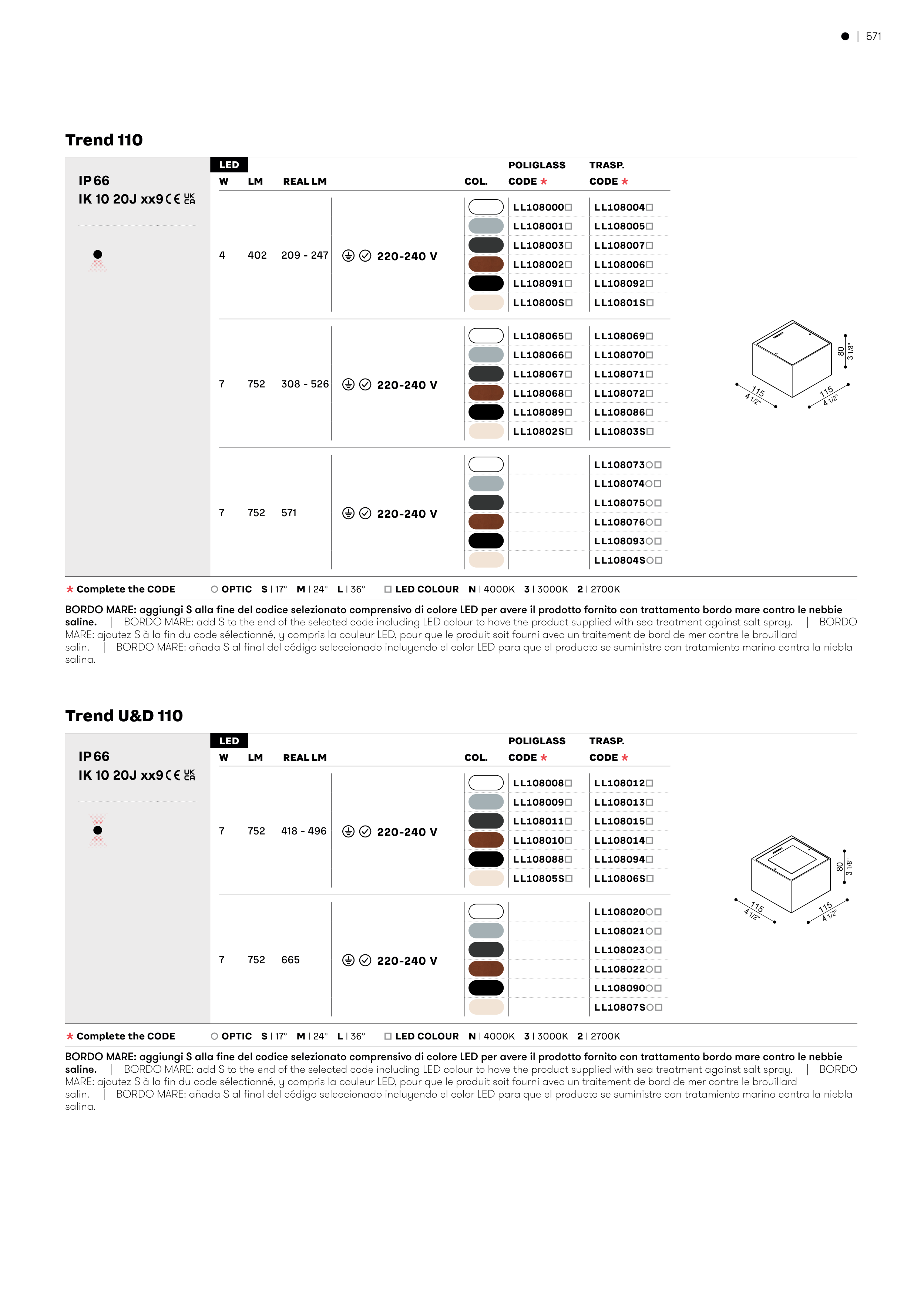 BORDO MARE: aggiungi S alla fine del codice selezionato comprensivo di colore LED per avere il prodotto fornito con trattamento bordo mare contro le nebbie