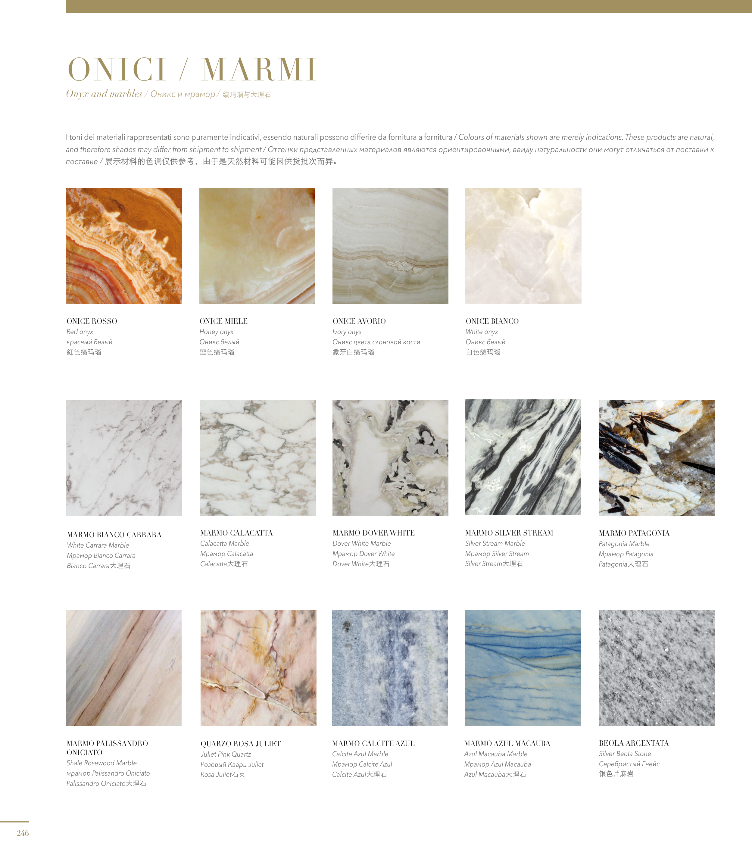 I toni dei materiali rappresentati sono puramente indicativi, essendo naturali possono differire da fornitura a fornitura / Colours of materials shown are merely indications. These products are natural,