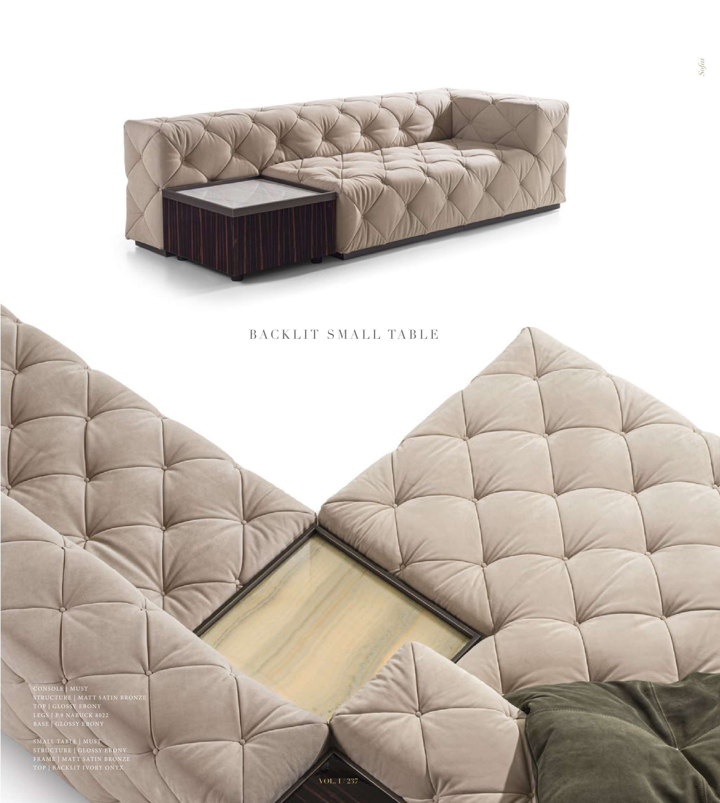 B A C K L I T S M A L L TA B L E CONSOLE | MUST STRUCTURE | MATT SATIN BRONZE TOP | GLOSSY EBONY LEGS | P.9 NABUCK 8022 BASE | GLOSSY EBONY SMALL TABLE | MUST STRUCTURE | GLOSSY EBONY FRAME | MATT SATIN BRONZE TOP | BACKLIT IVORY ONYX Sofas VOL. I / 237