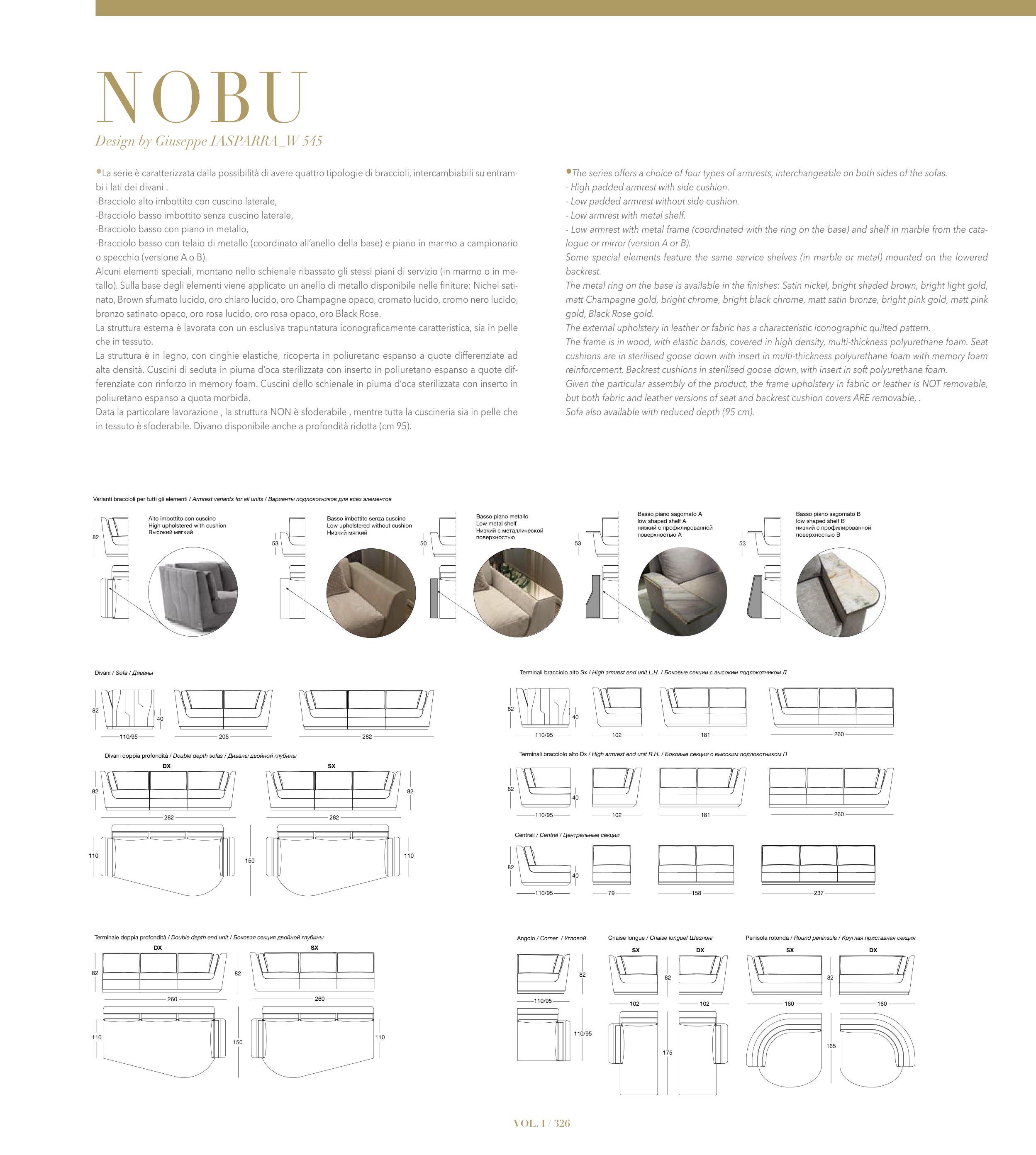 •The series offers a choice of four types of armrests, interchangeable on both sides of the sofas.