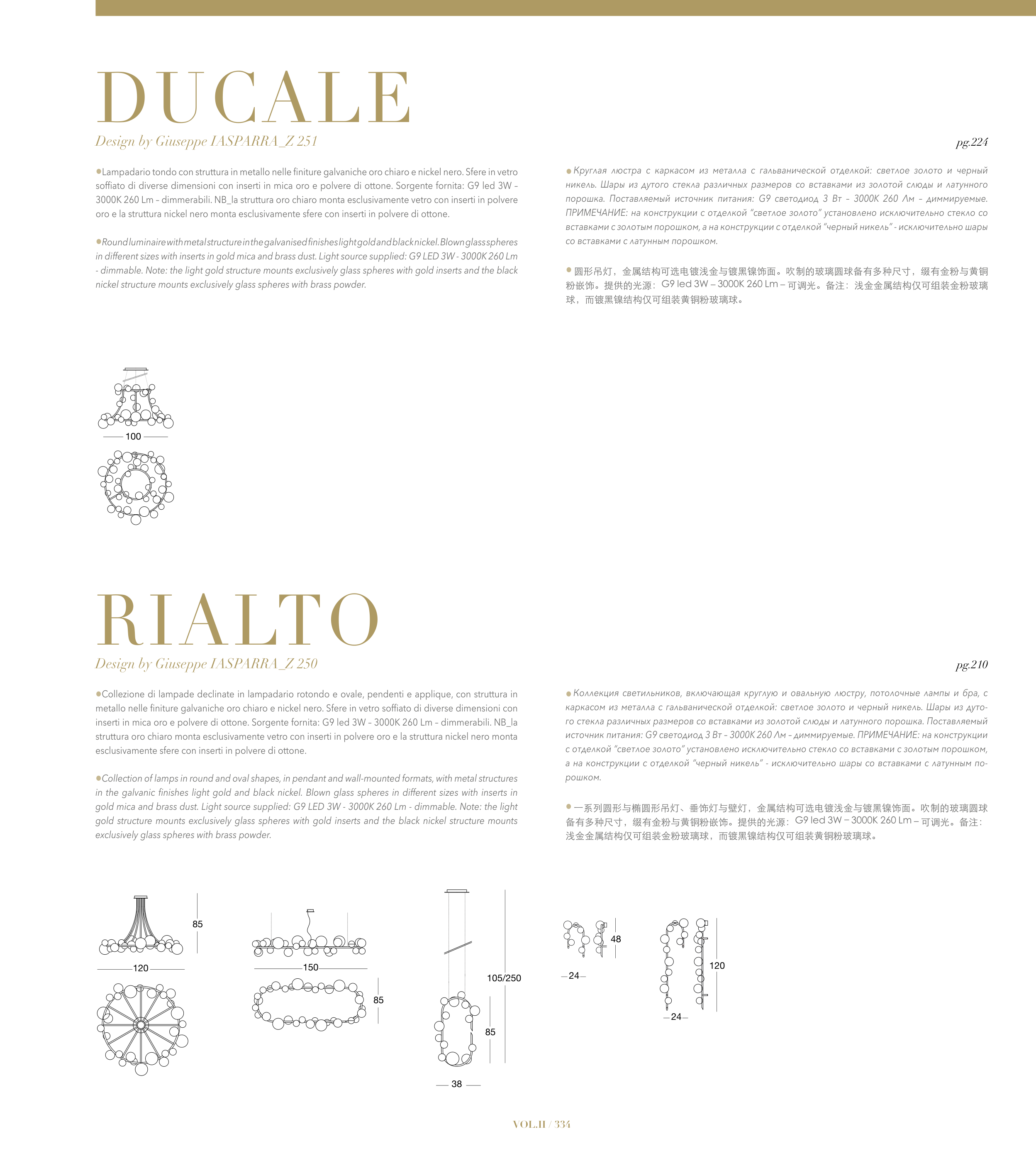 备有多种尺寸,缀有金粉与黄铜粉嵌饰。提供的光源:G9 led 3W – 3000K 260 Lm – 可调光。备注: