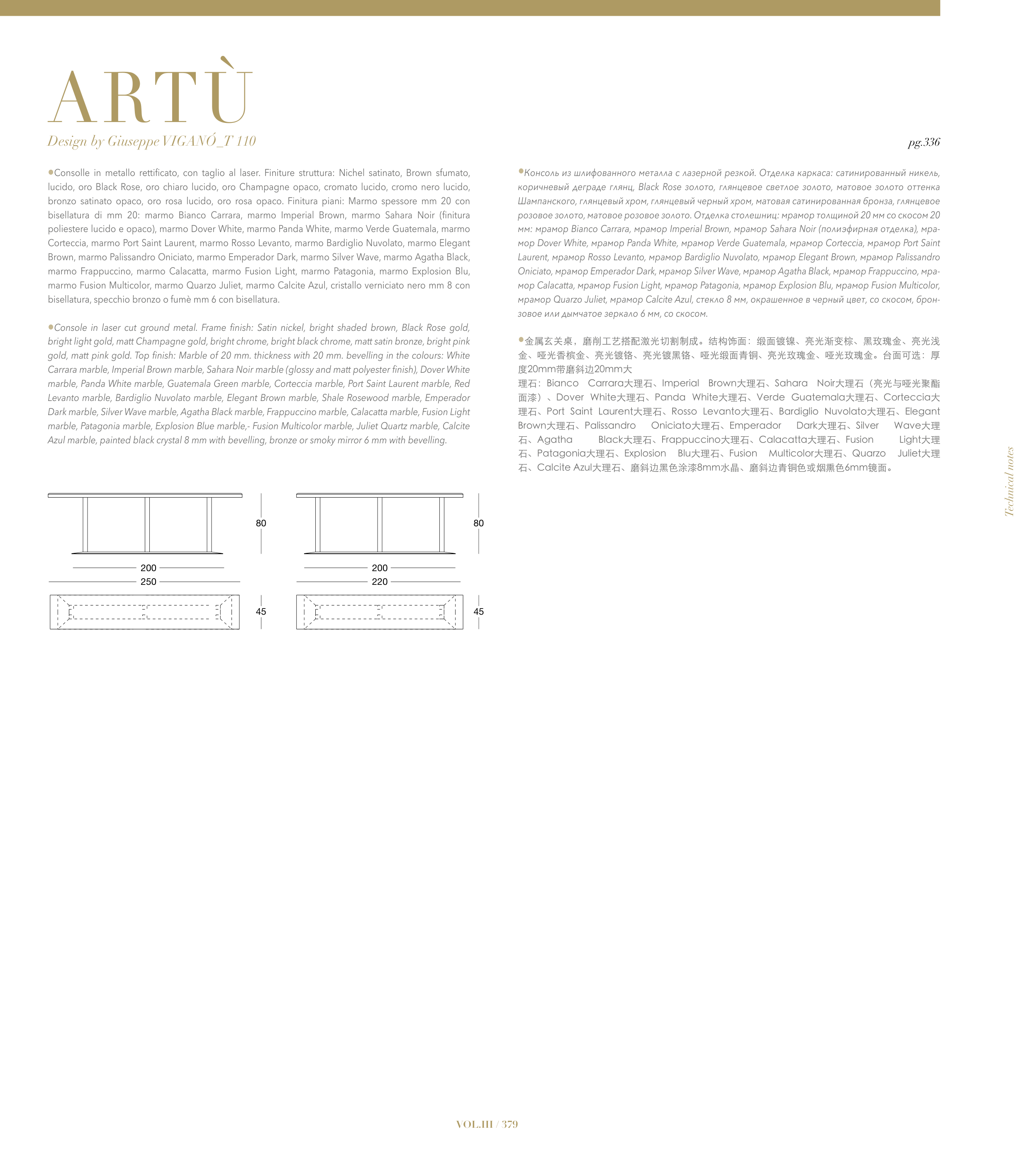 bronzo satinato opaco, oro rosa lucido, oro rosa opaco. Finitura piani: Marmo spessore mm 20 con