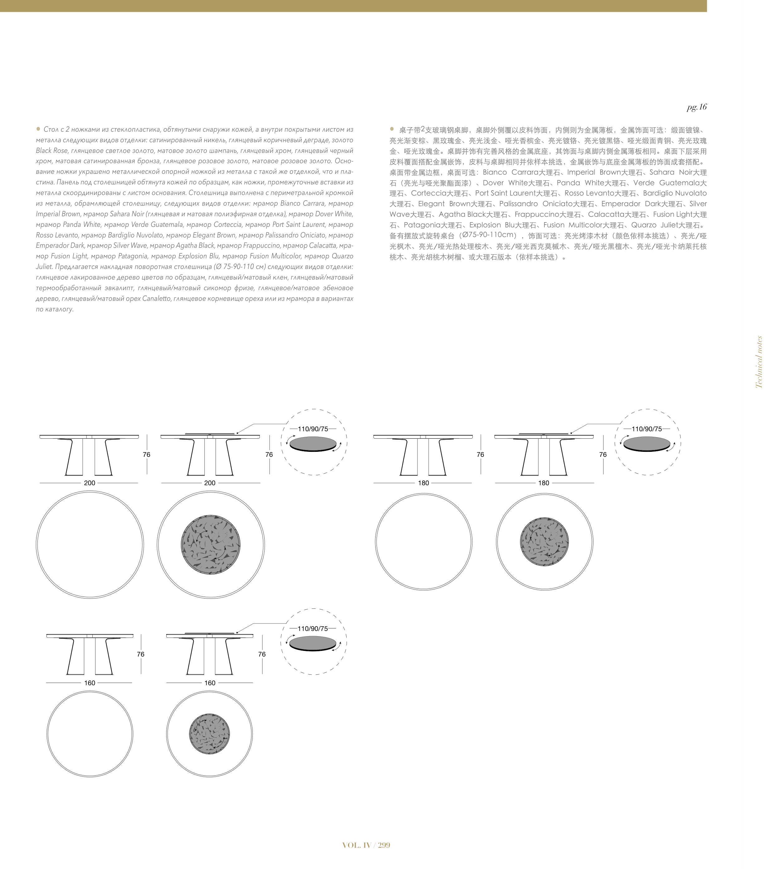 备有摆放式旋转桌台(Ø75-90-110cm),饰面可选:亮光烤漆木材(颜色依样本挑选)、亮光∕哑