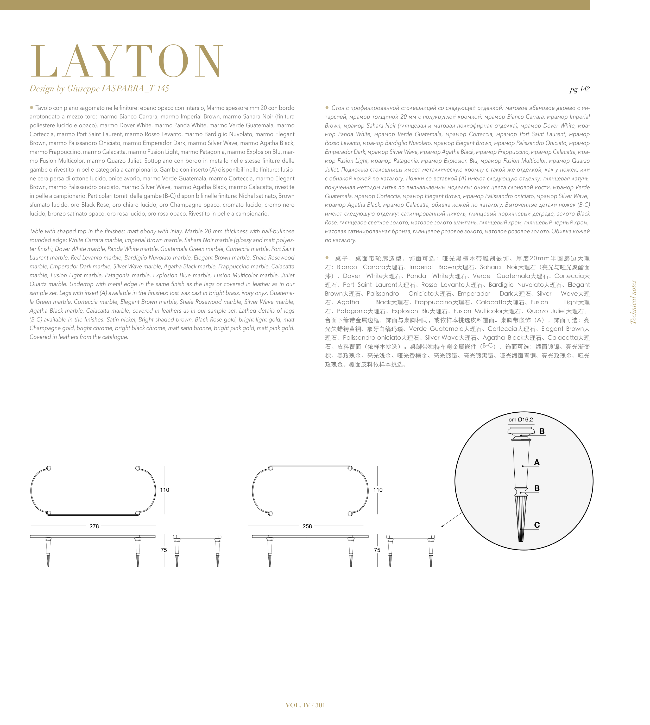石、皮料覆面(依样本挑选)。桌脚带独特车削金属嵌件(B-C),饰面可选:缎面镀镍、亮光渐变