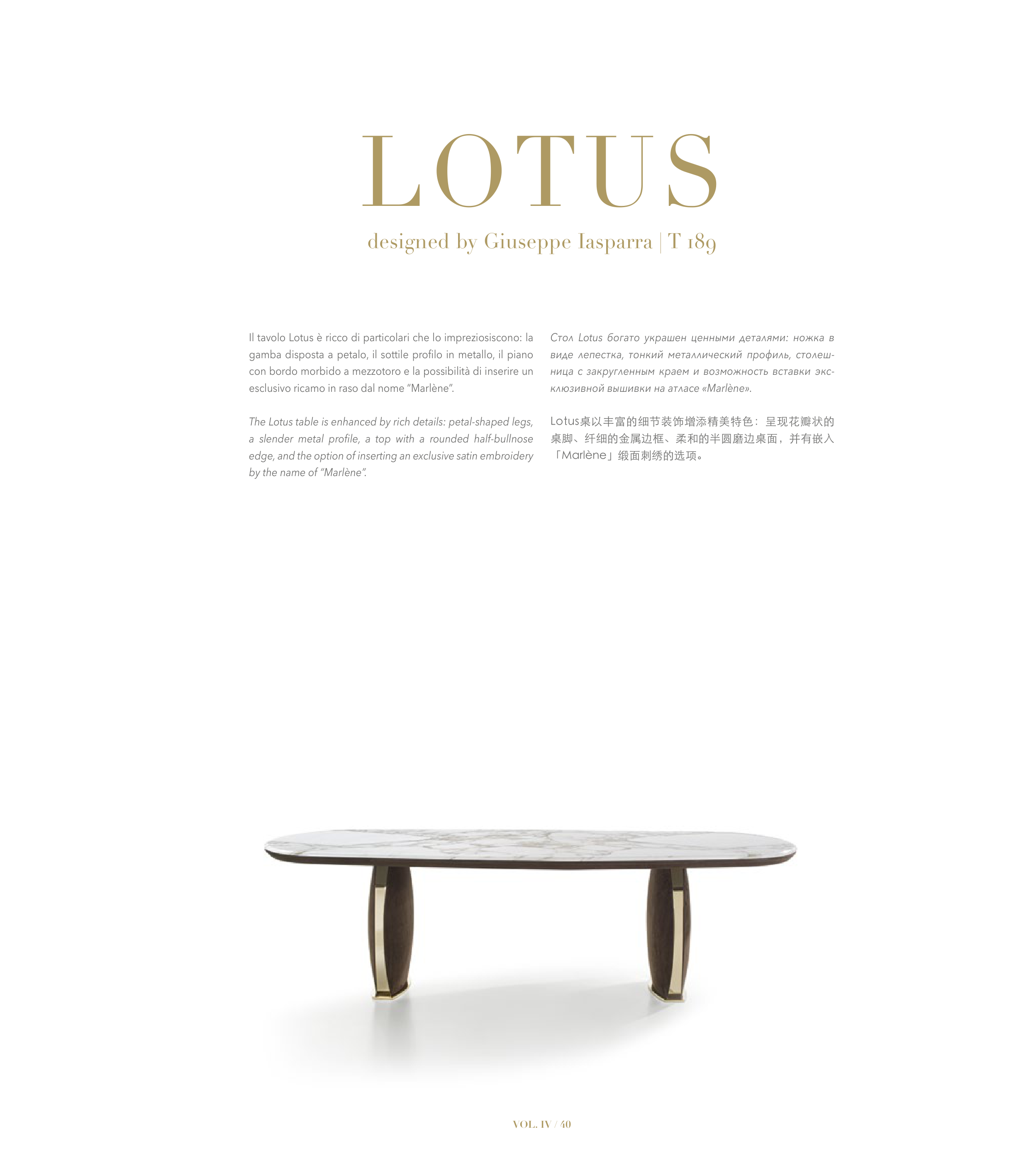The Lotus table is enhanced by rich details: petal-shaped legs,