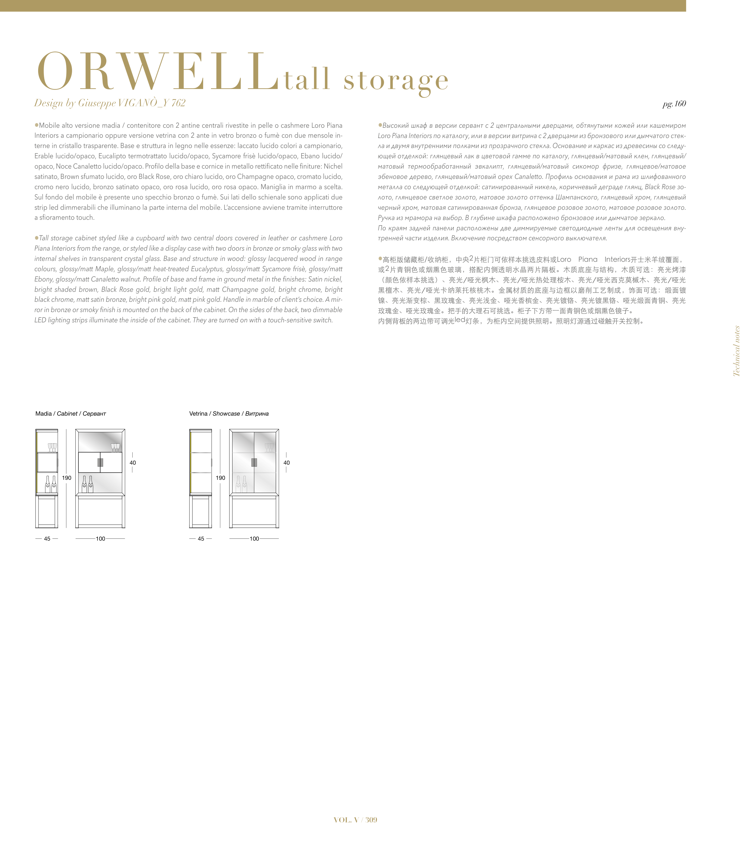 •Высокий шкаф в версии сервант с 2 центральными дверцами, обтянутыми кожей или кашемиром