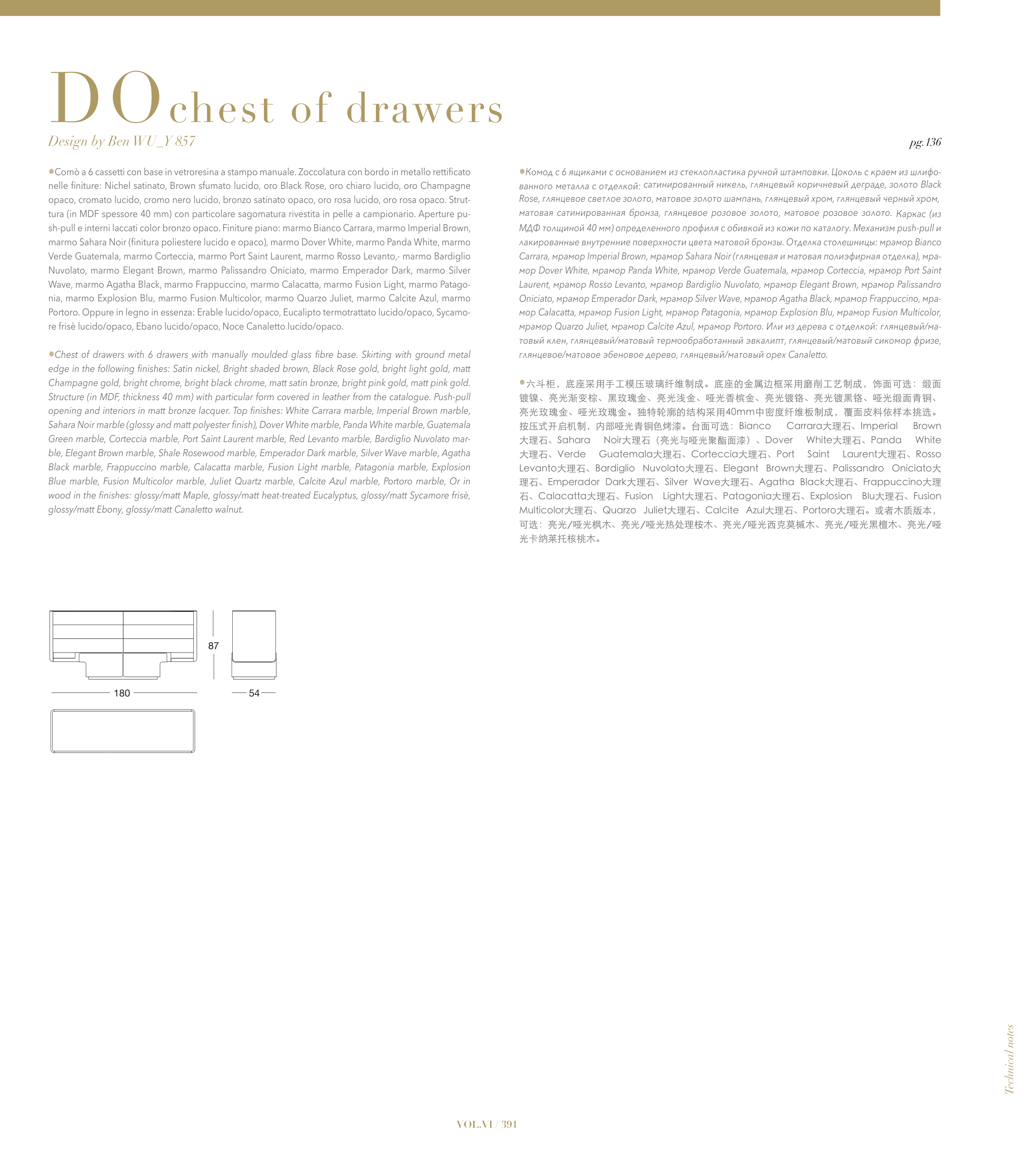 •六斗柜,底座采用手工模压玻璃纤维制成。底座的金属边框采用磨削工艺制成,饰面可选:缎面