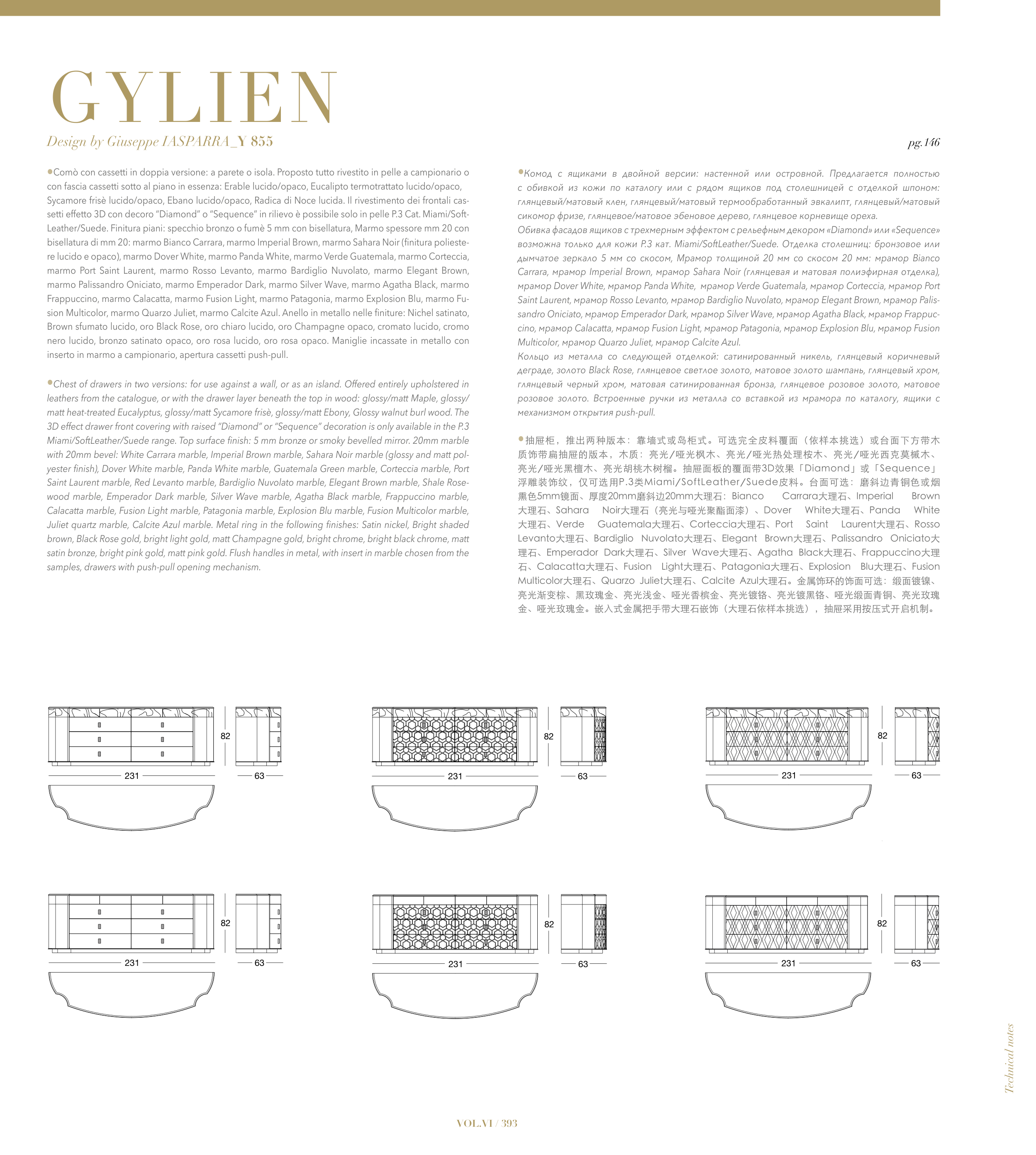 •Chest of drawers in two versions: for use against a wall, or as an island. Offered entirely upholstered in