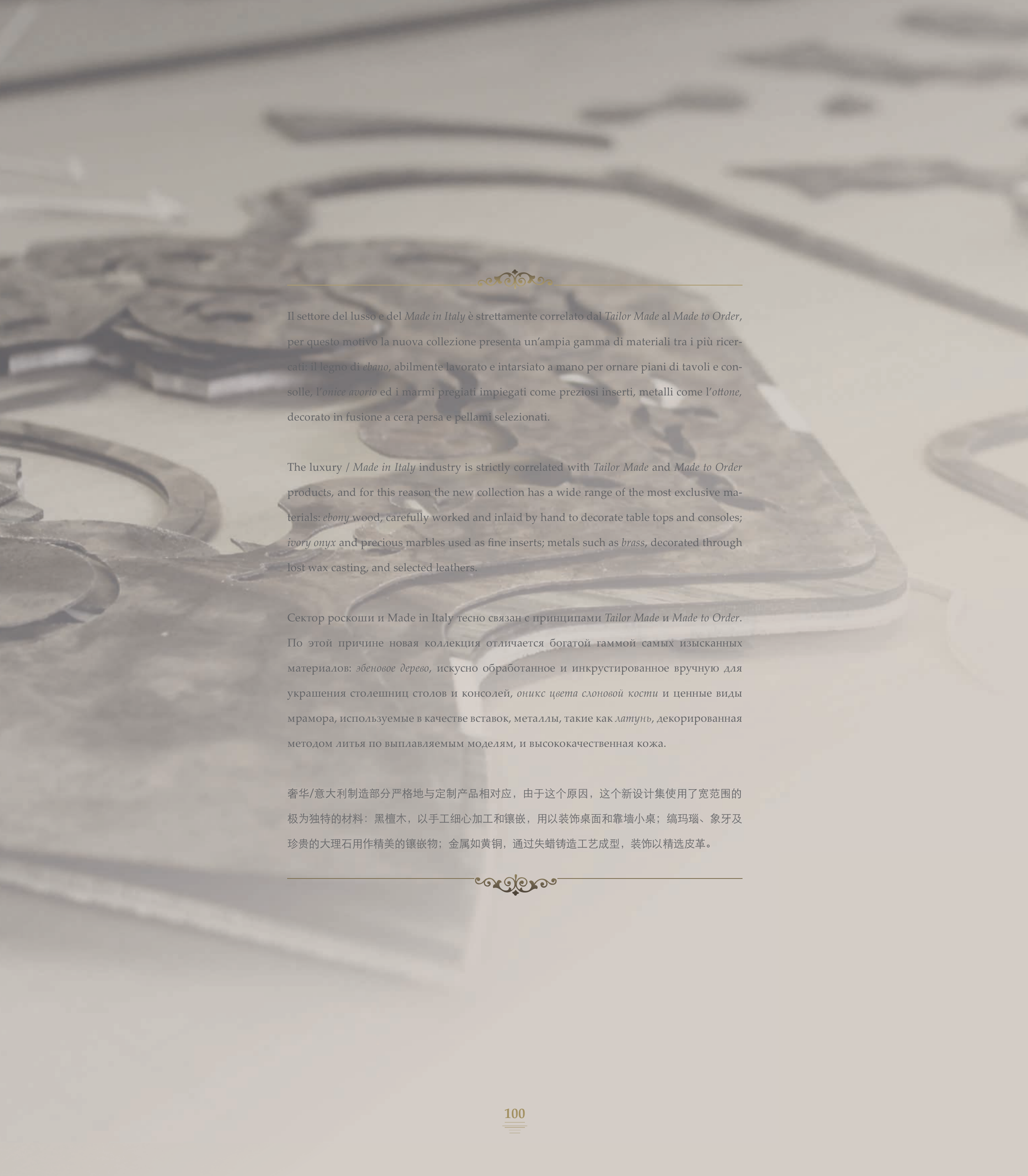 珍贵的大理石用作精美的镶嵌物;金属如黄铜,通过失蜡铸造工艺成型,装饰以精选皮革。