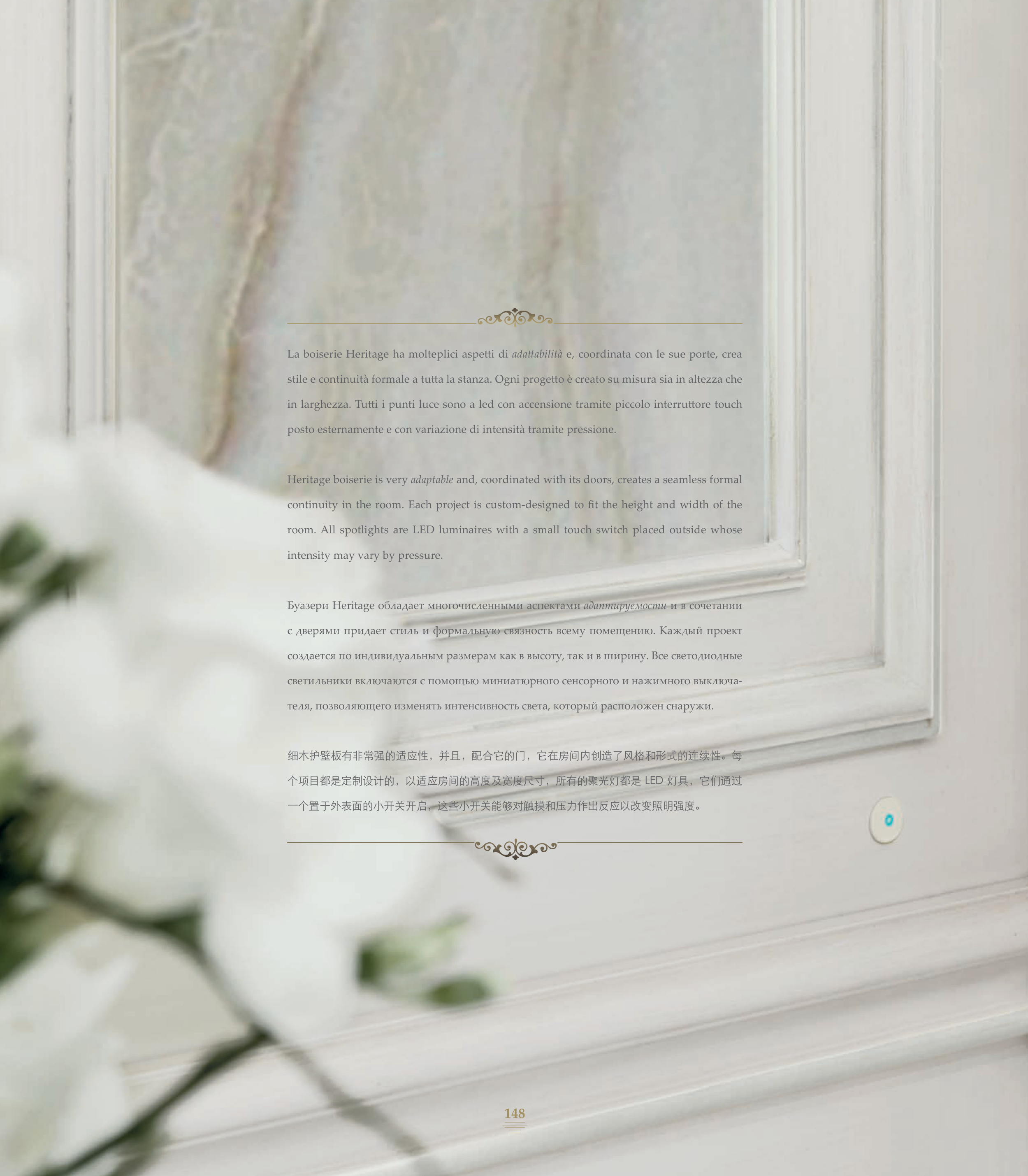 La boiserie Heritage ha molteplici aspetti di adattabilità e, coordinata con le sue porte, crea