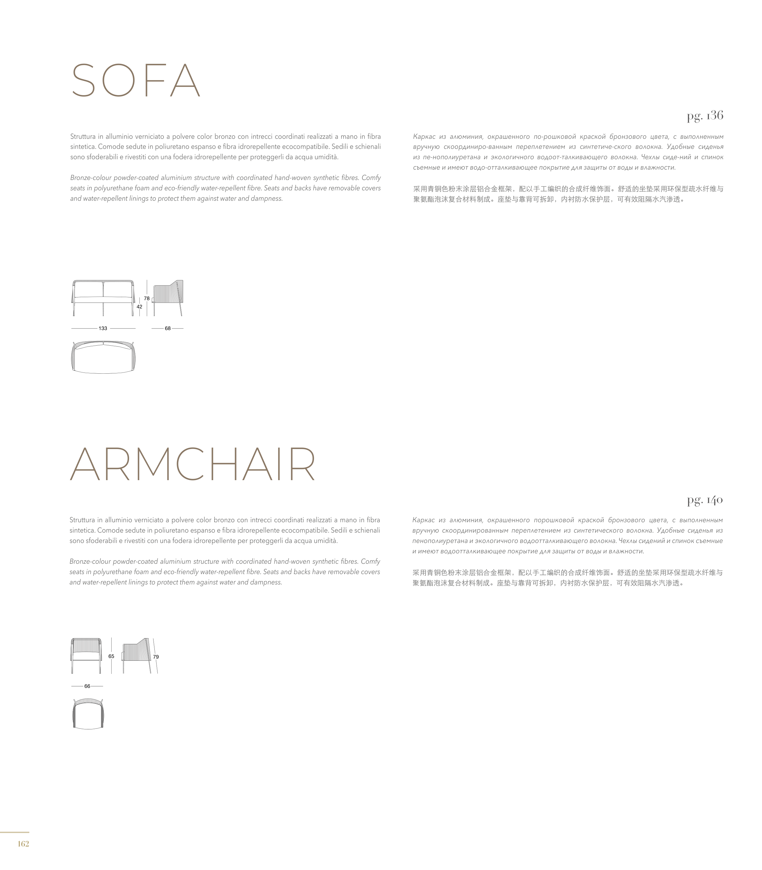 采用青铜色粉末涂层铝合金框架,配以手工编织的合成纤维饰面。舒适的坐垫采用环保型疏水纤维与