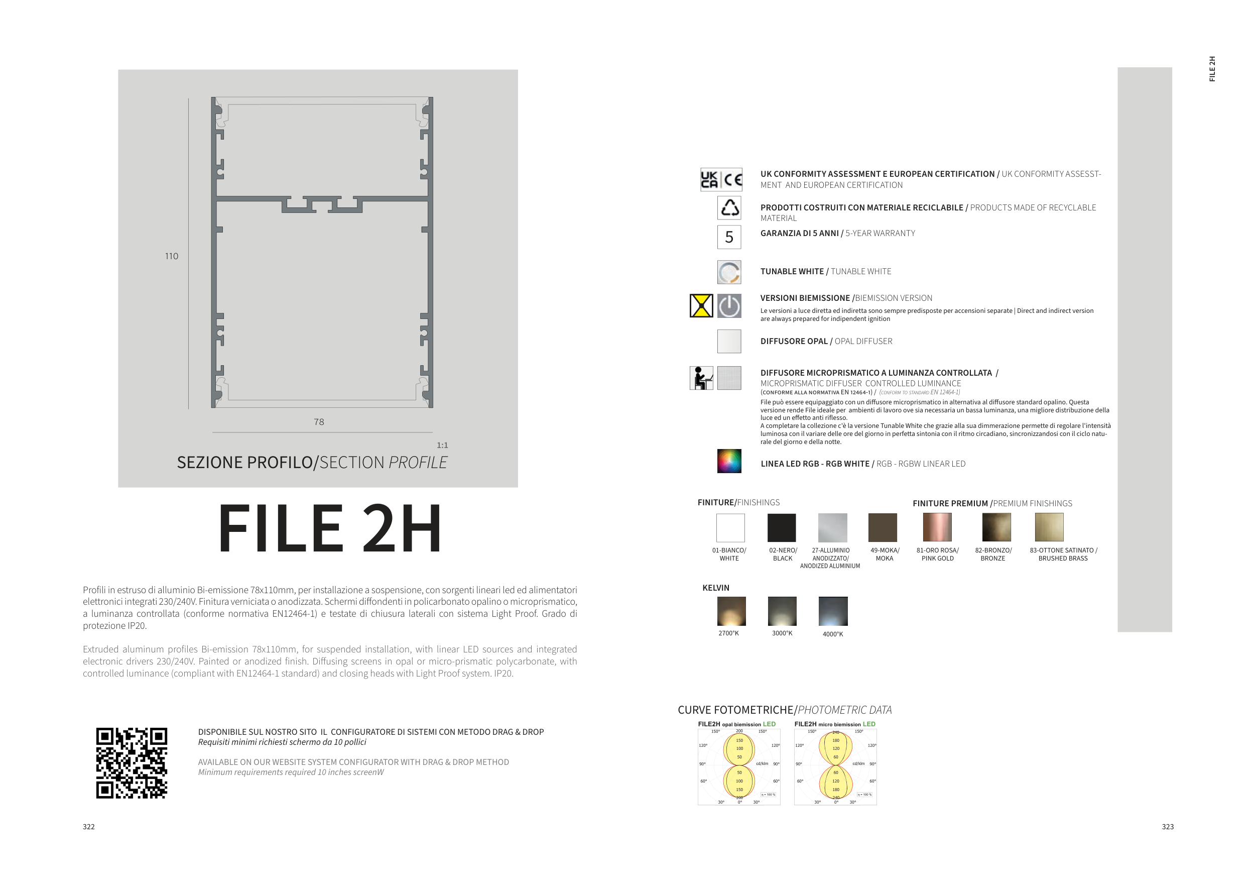 electronic drivers 230/240V. Painted or anodized finish. Diffusing screens in opal or micro-prismatic polycarbonate, with