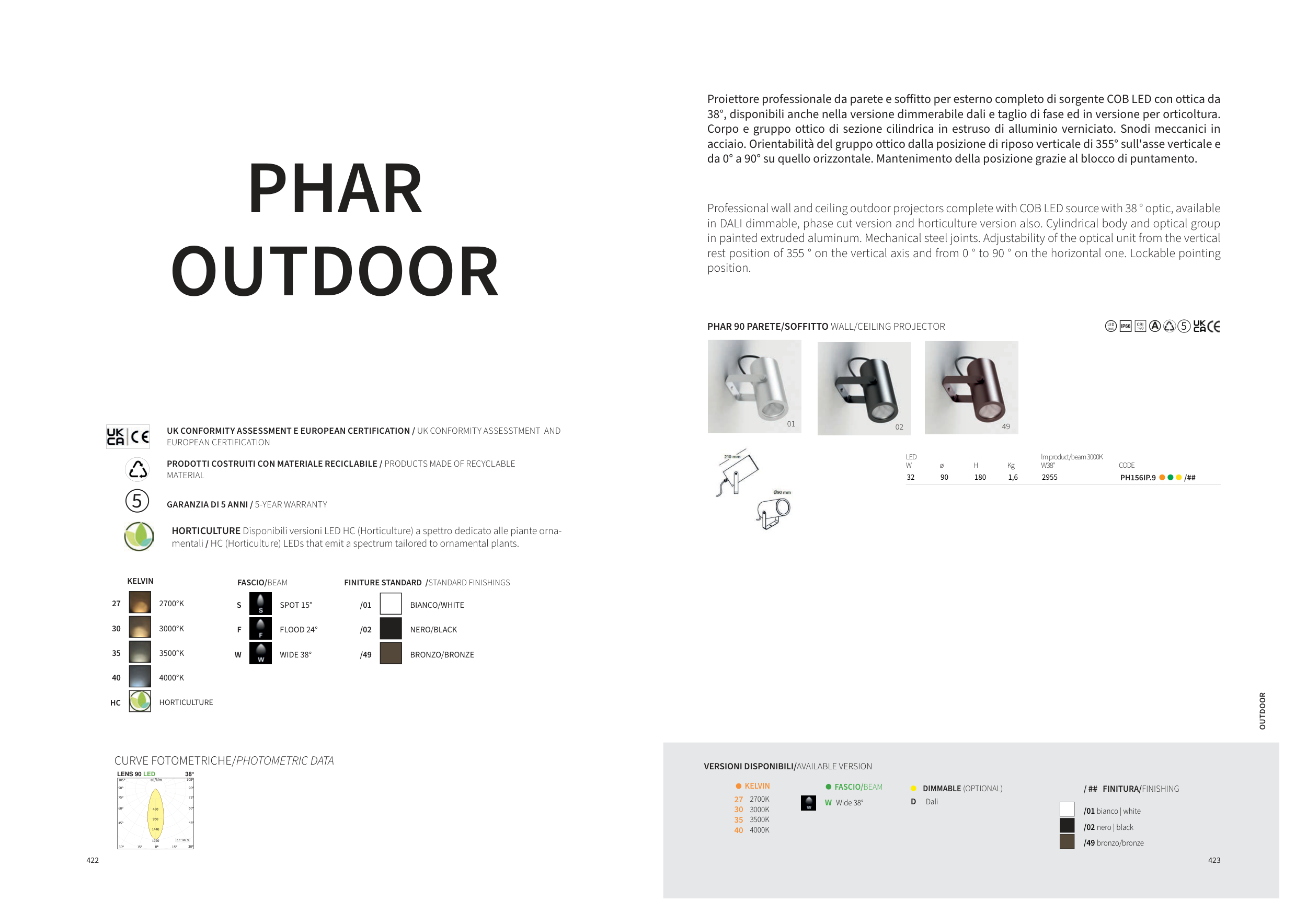 38°, disponibili anche nella versione dimmerabile dali e taglio di fase ed in versione per orticoltura.