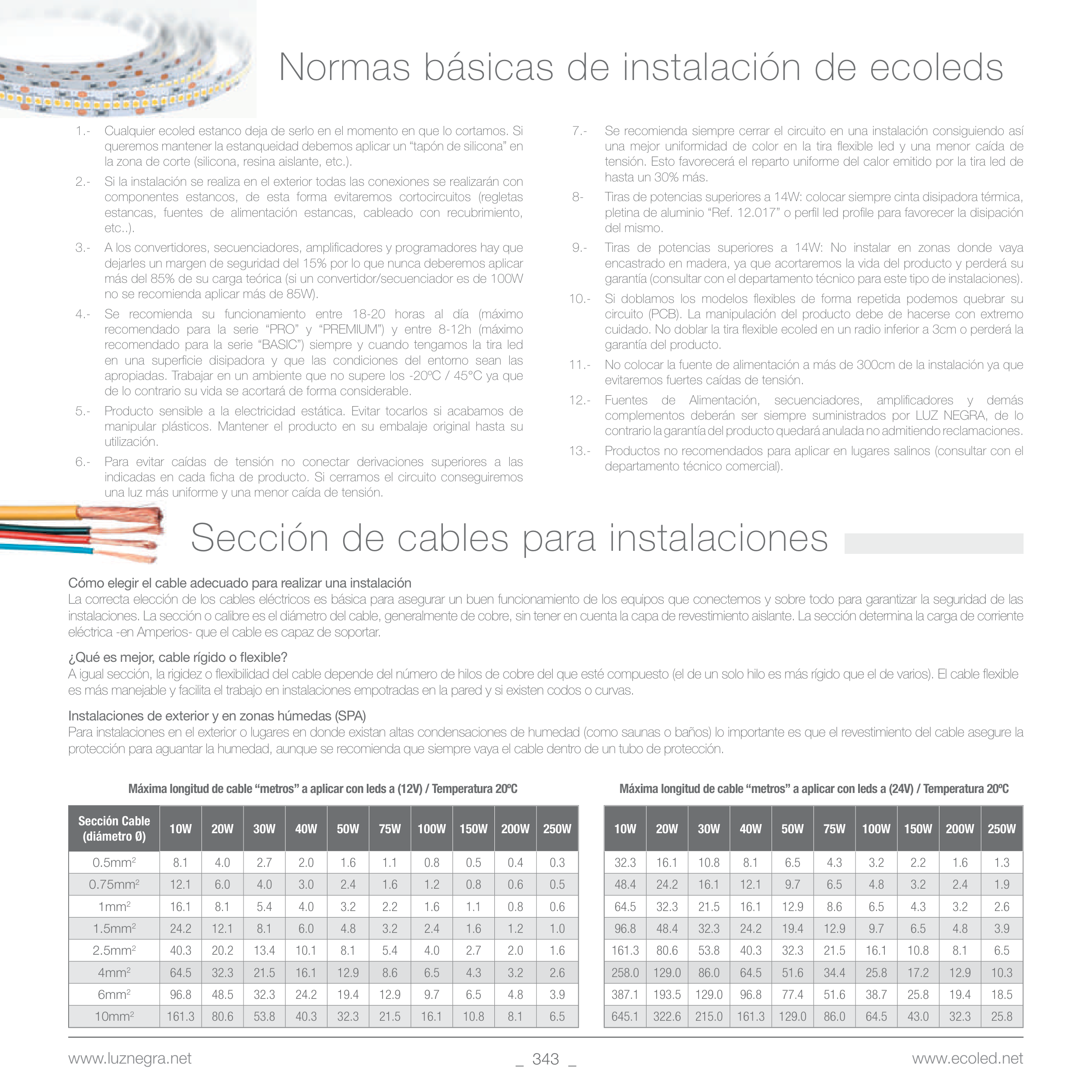 Máxima longitud de cable “metros” a aplicar con leds a (12V) / Temperatura 20ºC