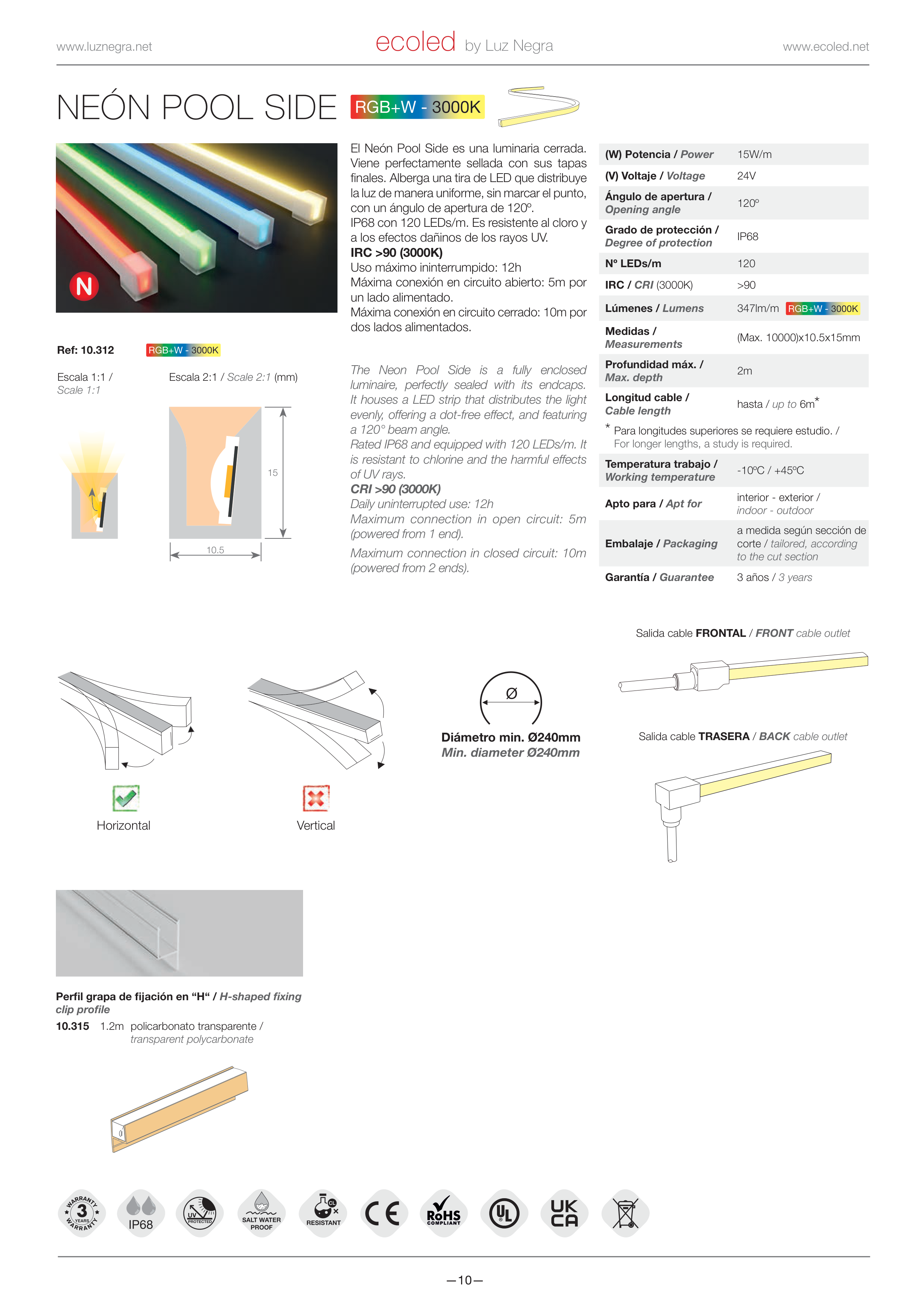 IP68 con 120 LEDs/m. Es resistente al cloro y