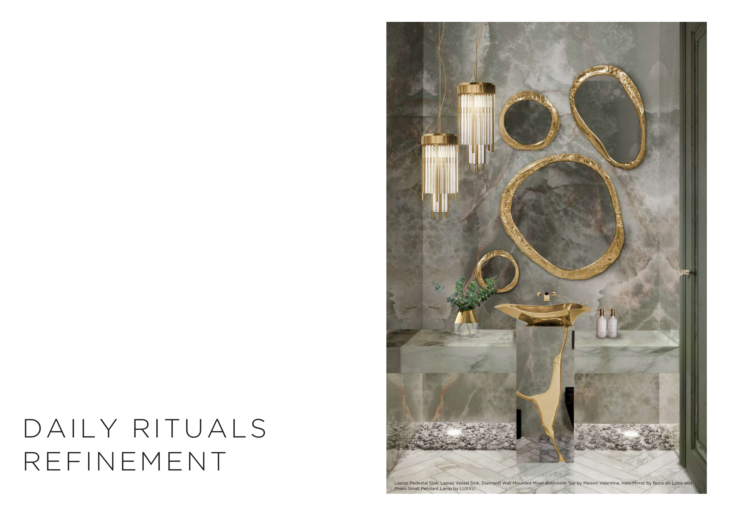 Lapiaz Pedestal Sink, Lapiaz Vessel Sink, Diamond Wall Mounted Mixer Bathroom Tap by Maison Valentina, Halo Mirror by Boca do Lobo and