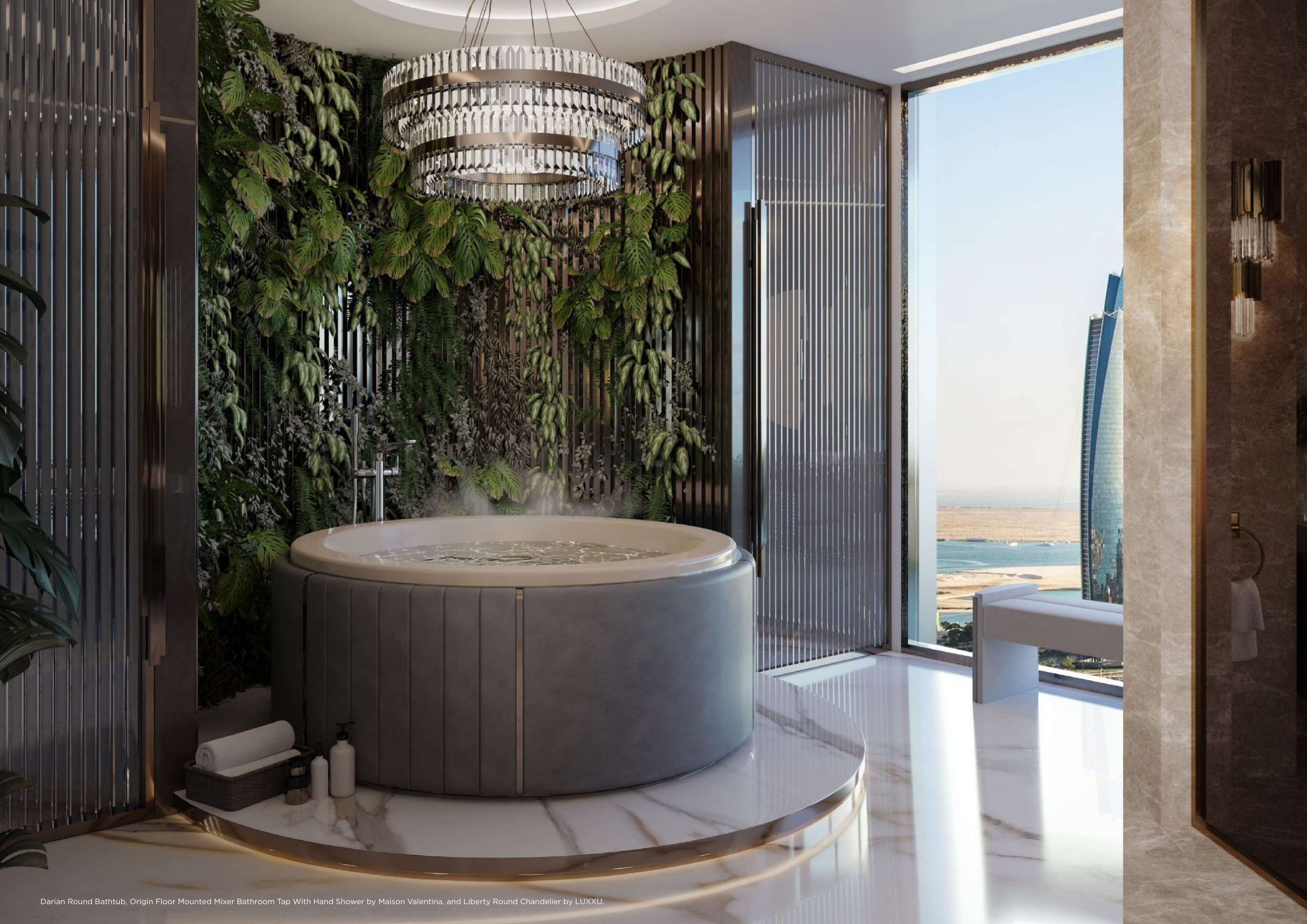 Darian Round Bathtub, Origin Floor Mounted Mixer Bathroom Tap With Hand Shower by Maison Valentina, and Liberty Round Chandelier by LUXXU.