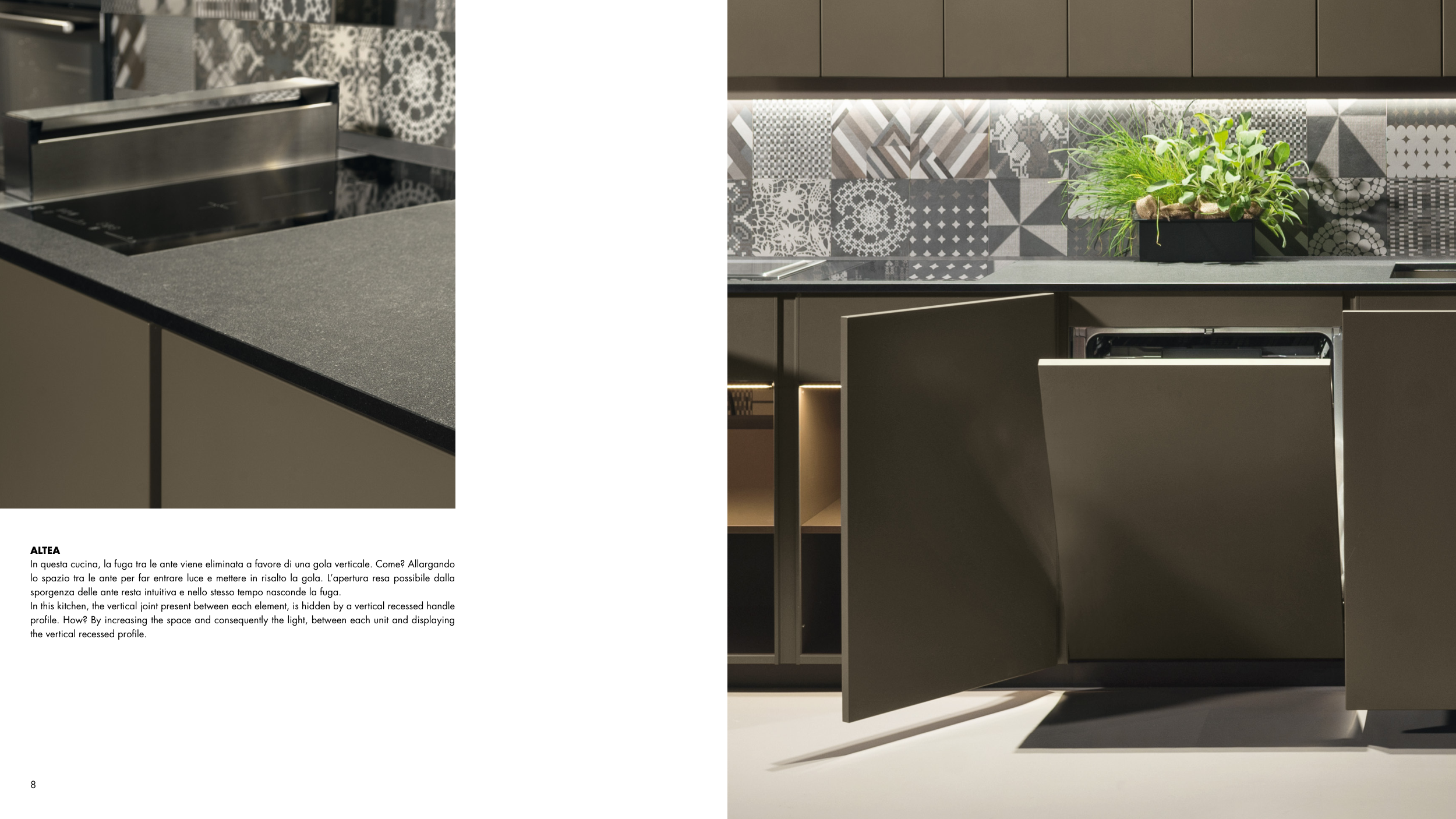In this kitchen, the vertical joint present between each element, is hidden by a vertical recessed handle
