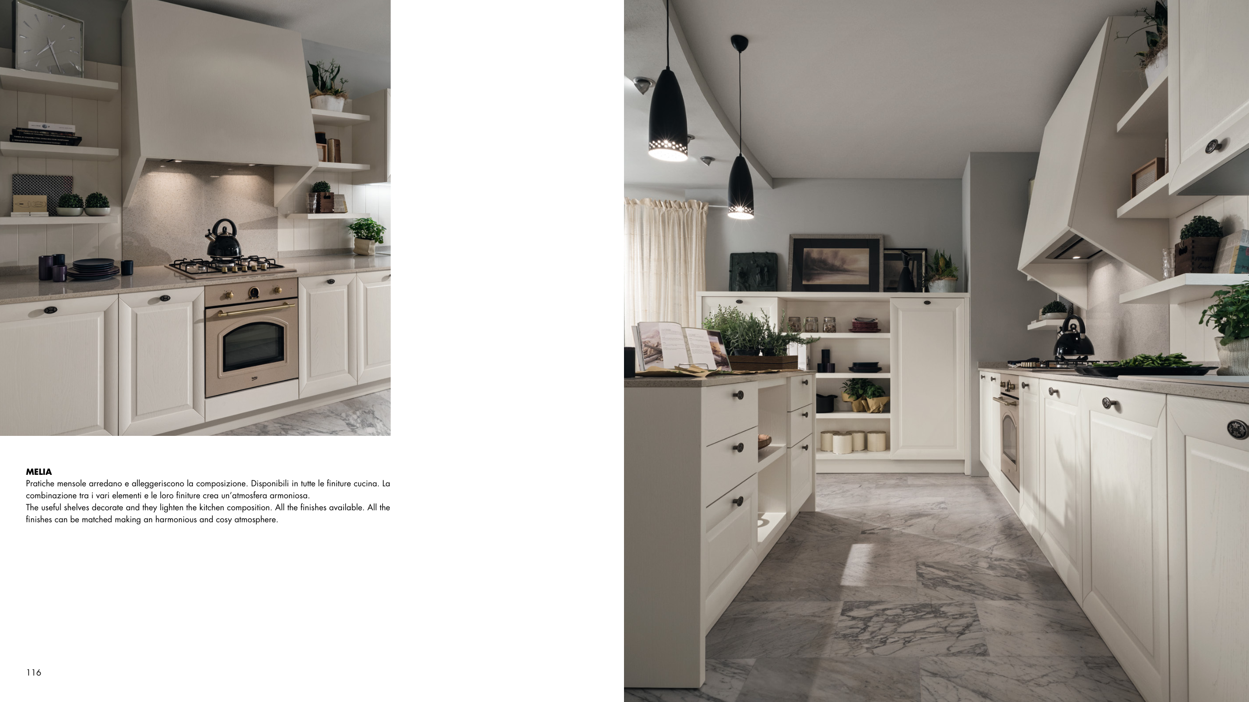 The useful shelves decorate and they lighten the kitchen composition. All the finishes available. All the