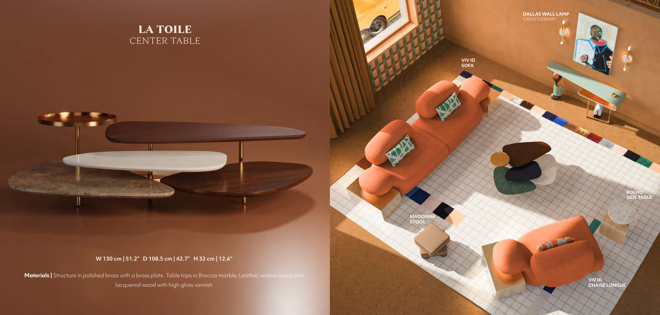 Materials | Structure in polished brass with a brass plate. Table tops in Breccia marble, Leather, walnut wood and