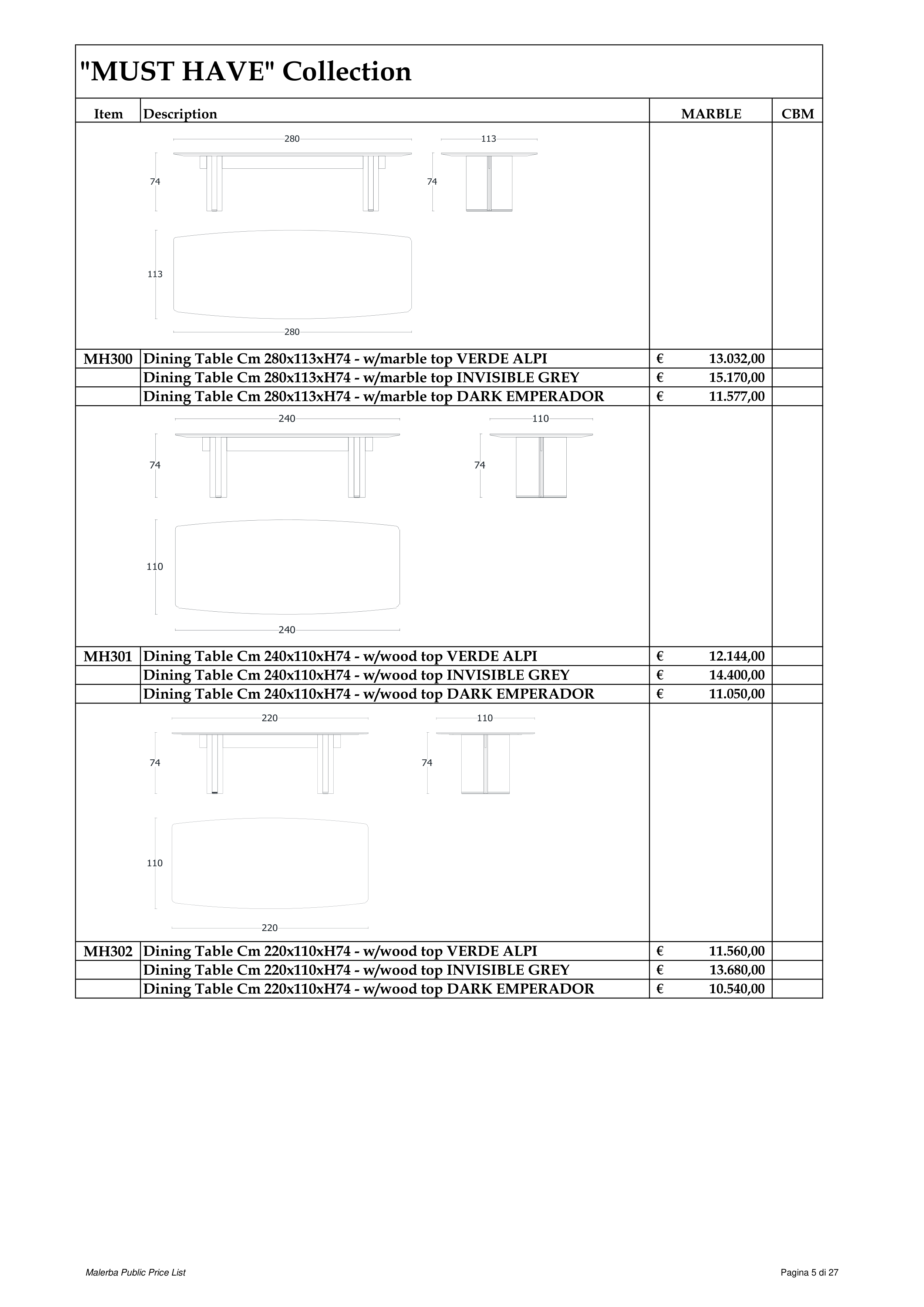 MH300 Dining Table Cm 280x113xH74 - w/marble top VERDE ALPI