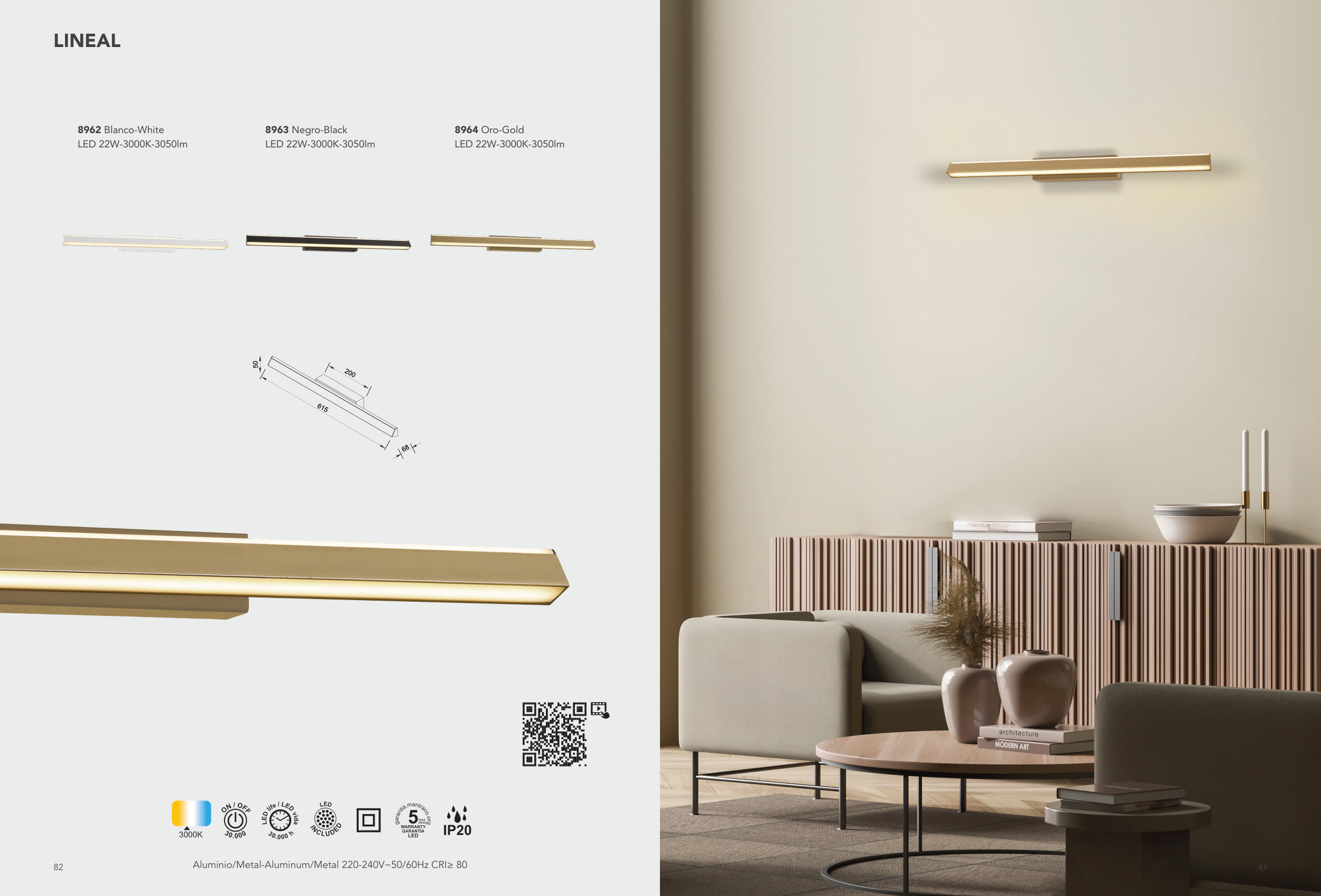 h 3000K MODO DE USO 82 83 LINEAL Aluminio/Metal-Aluminum/Metal 220-240V~50/60Hz CRI≥ 80 8962 Blanco-White LED 22W-3000K-3050lm 8963 Negro-Black LED 22W-3000K-3050lm 8964 Oro-Gold LED 22W-3000K-3050lm